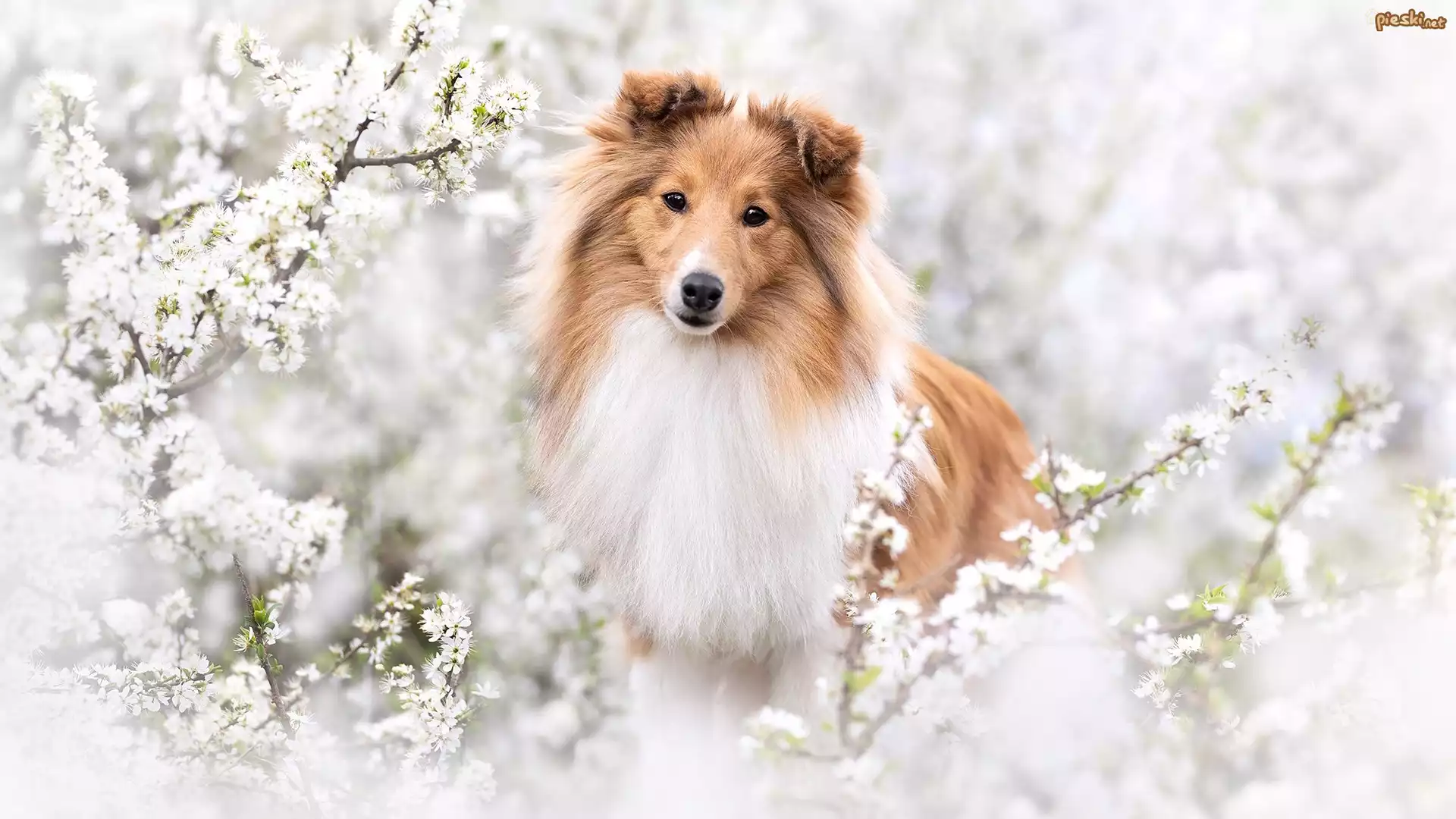 Pies Pies, Owczarek szetlandzki, Gałązki, Kwiaty, Białe