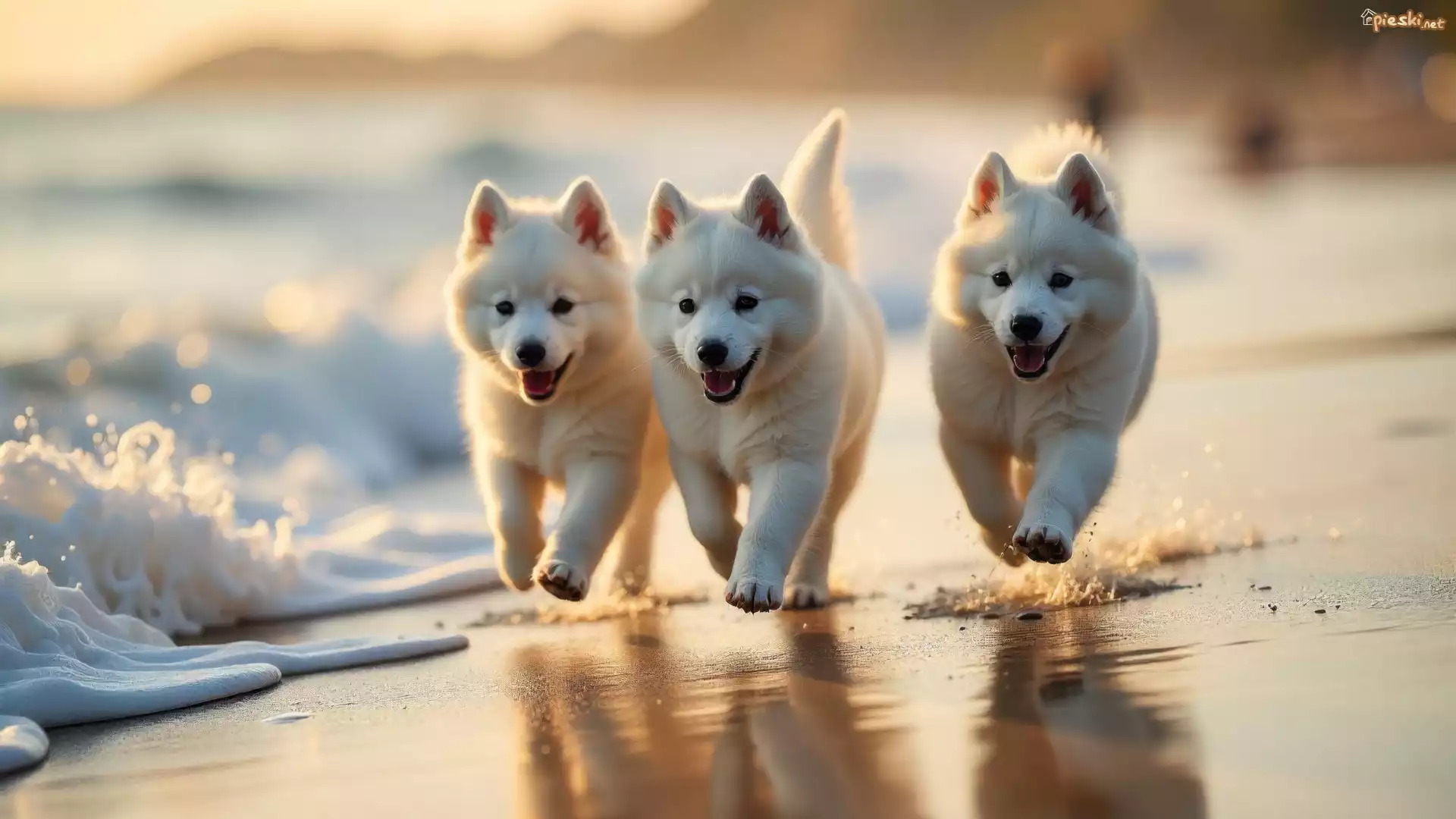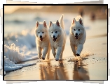 Pies Trzy, Białe, Psy, Szczeniaki, Plaża, Morze, Grafika AI