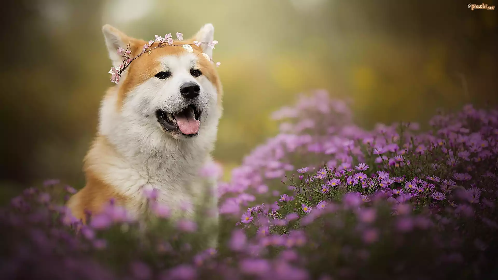 Pies Pies, Akita inu, Mordka, Wianek, Kwiaty, Astry marcinki