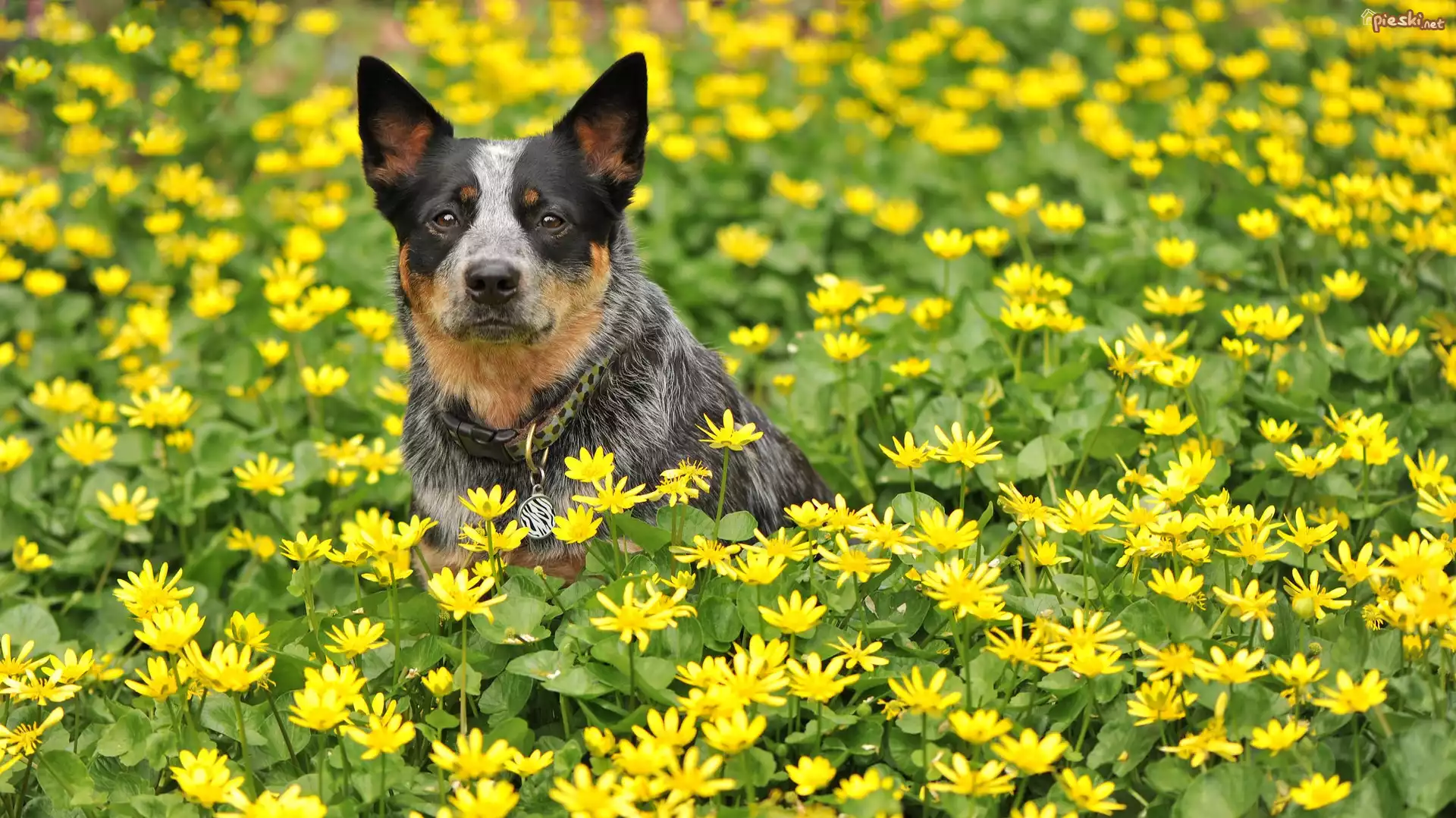 Pies Australian cattle dog, Łąka, Kwiaty