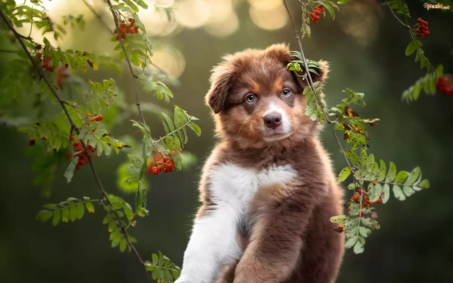 Pies Pies, Szczeniak, Owczarek australijski, Gałązki, Jarzębina, Listki