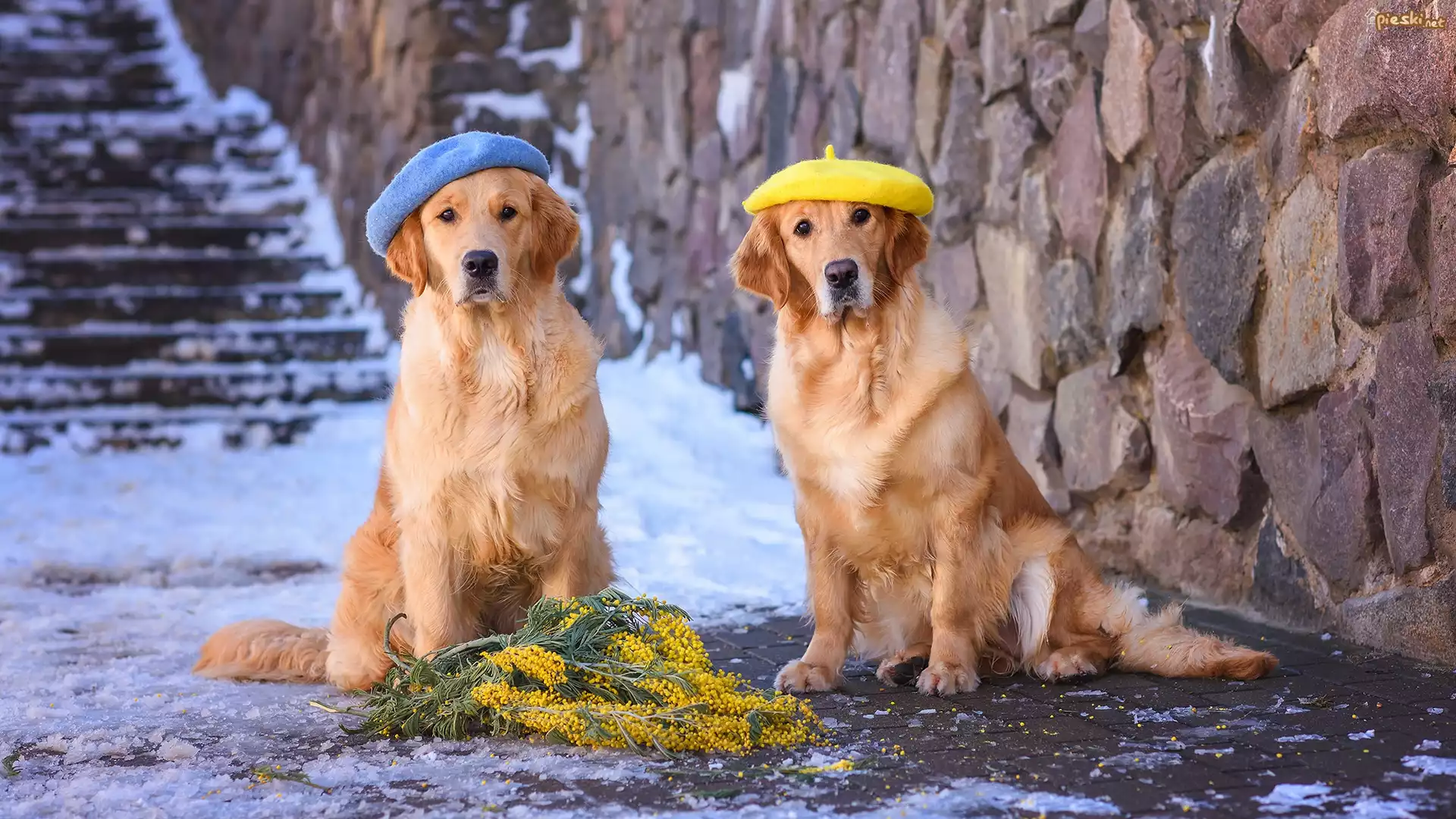 Psy, Golden retrievery, Berety, Gałązki, Akacja srebrzysta