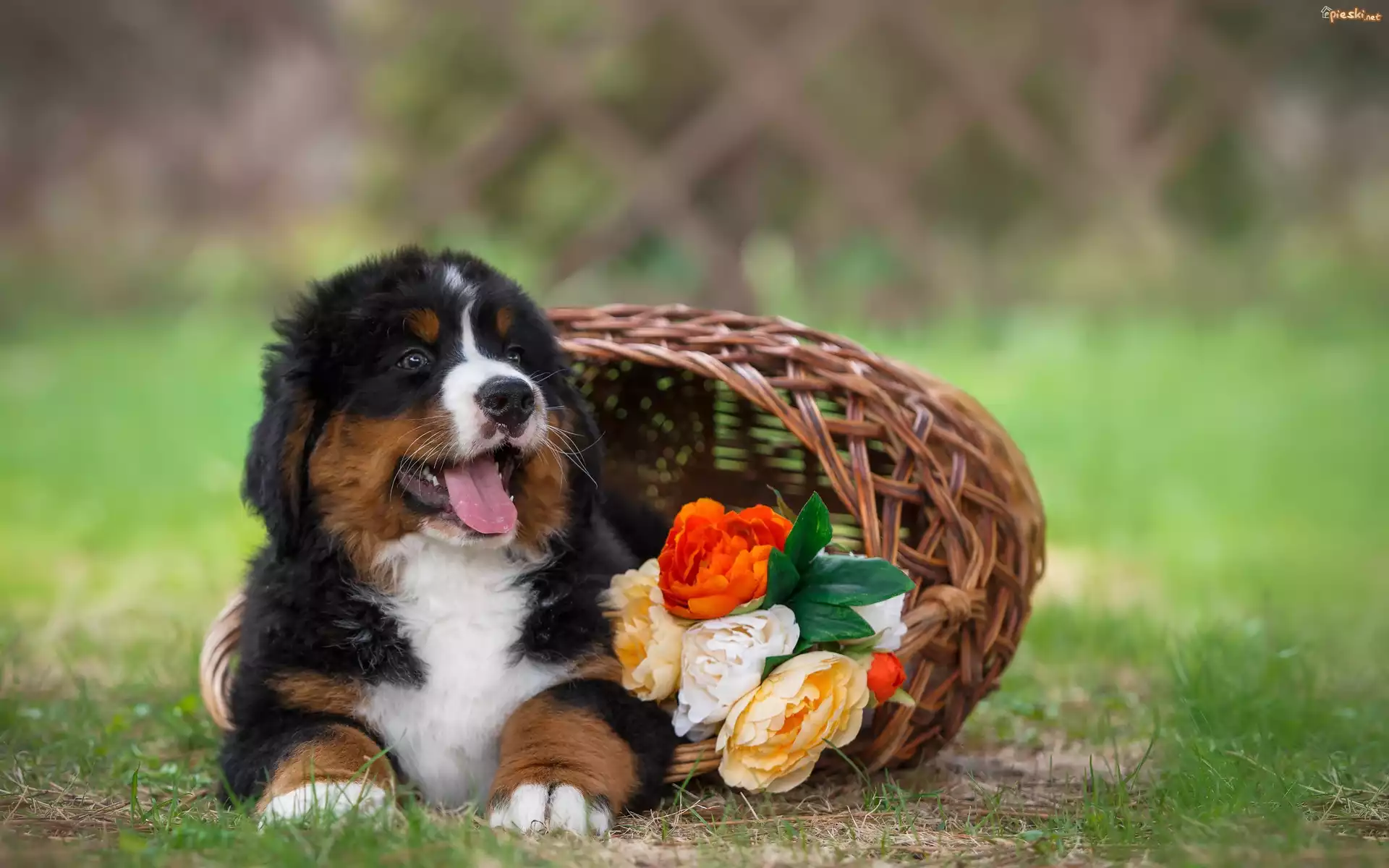 Berneński pies pasterski, Szczeniak, Koszyk, Kwiaty