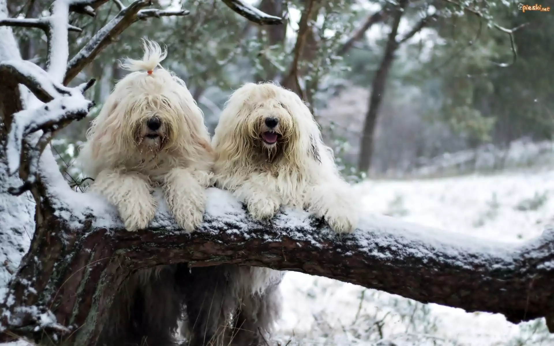 Dwa, Białe, Psy, Owczarki staroangielskie, Bobtail, Zima, Śnieg, Drzewo