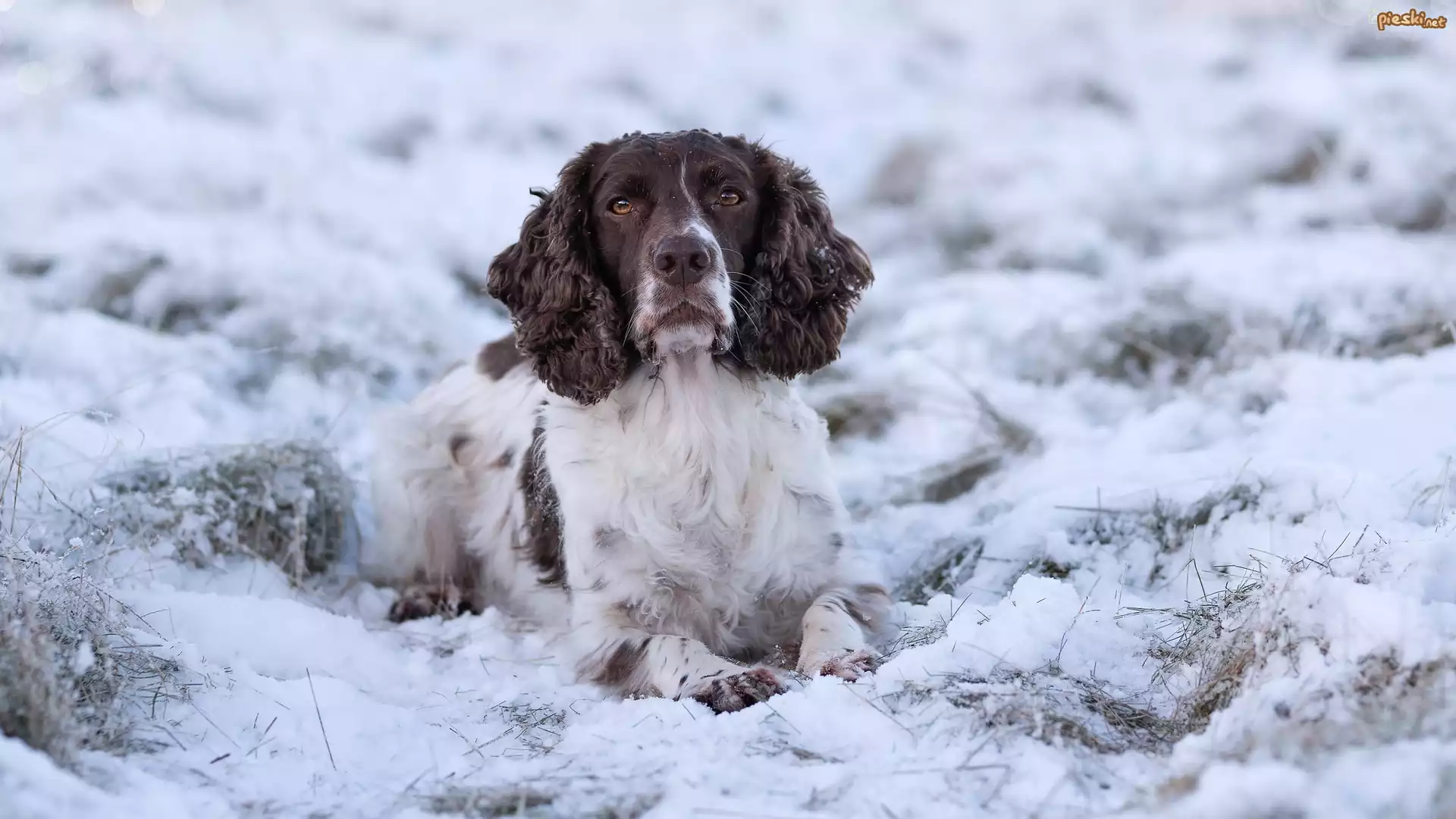 Pies Pies, Biało-brązowy, Springer spaniel angielski, Śnieg