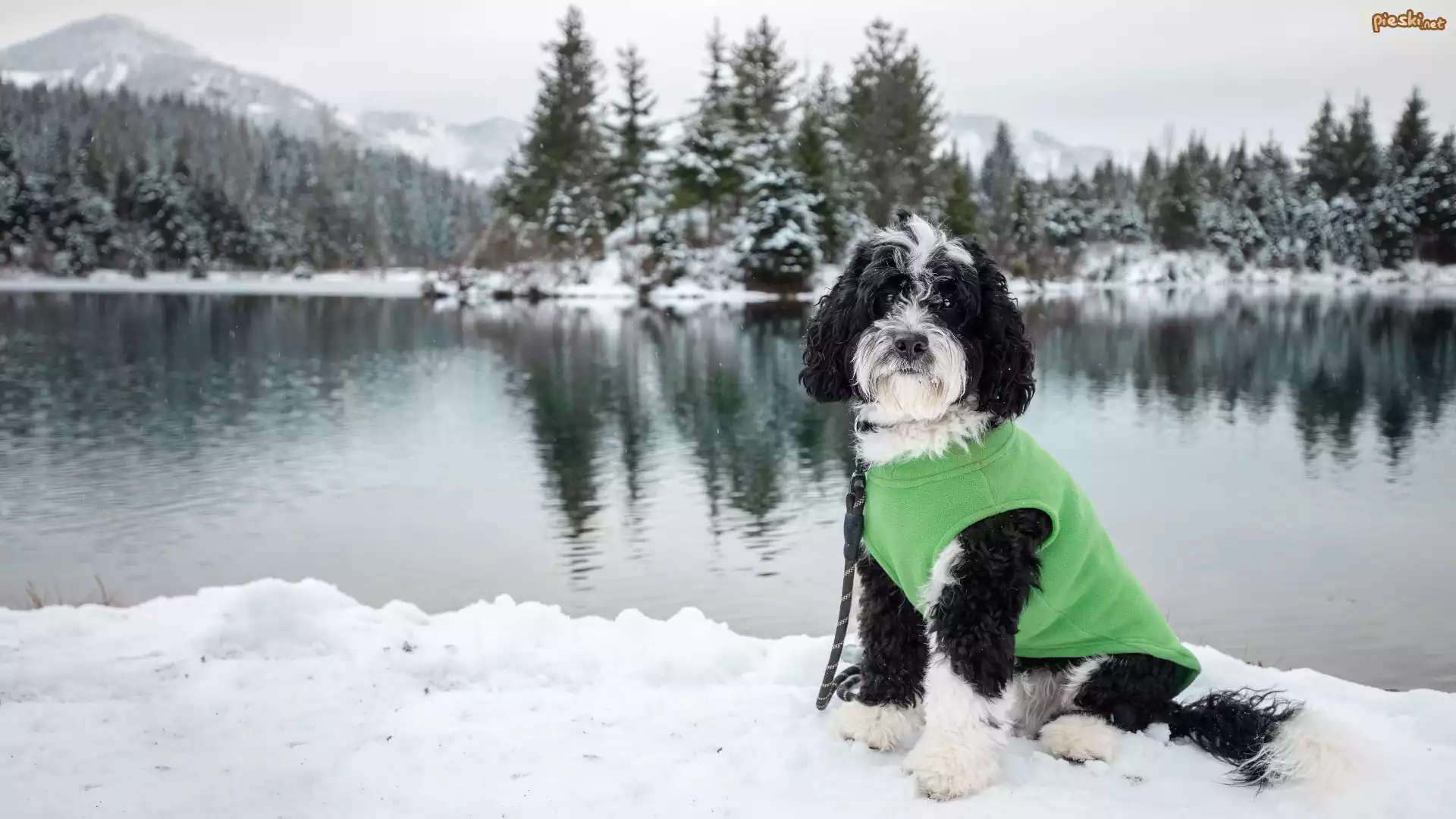Pies Czarno-biały, Pies, Smycz, Zielone, Ubranko, Zima