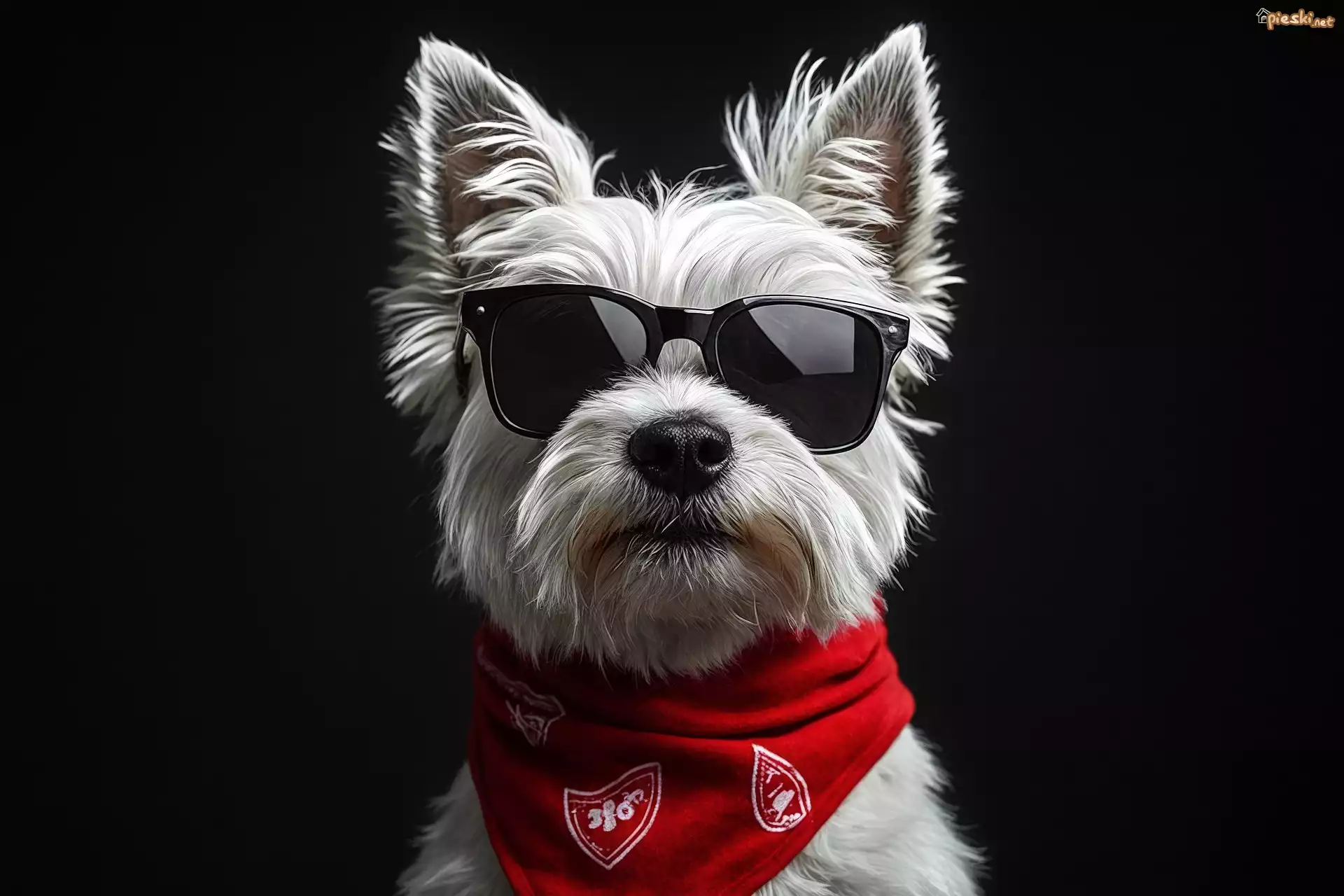 Pies Biały, Pies, West highland white terrier, Czarne, Okulary, Czerwona, Chustka