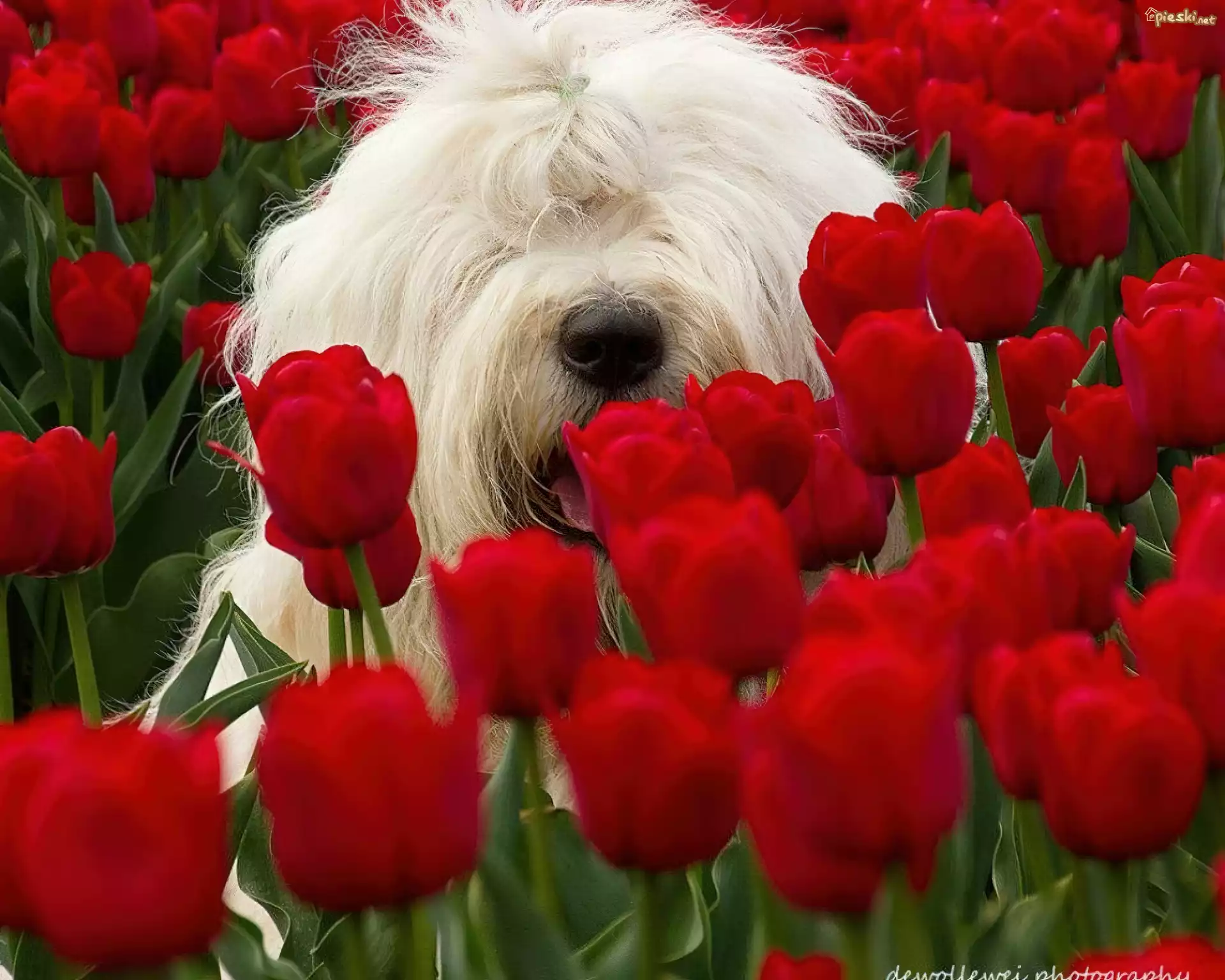 Pies Biały, Pies, Czerwone, Tulipany, Maltańczyk