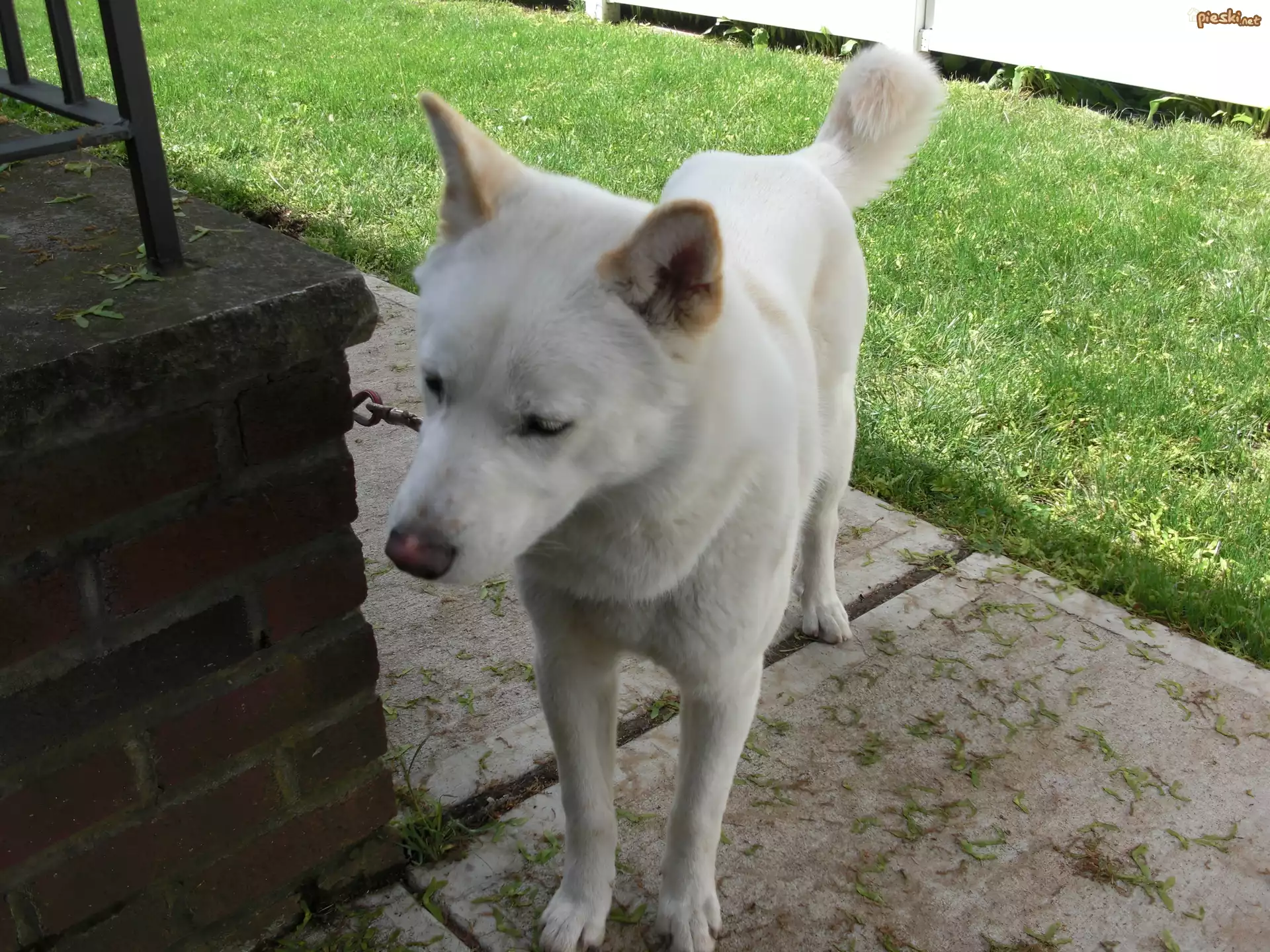 pysk, język, kły, Jindo Piesek, Jindo, Kamyczki Jindo, niebieskie, niebo Pies, Kapelusz, Skałki, Jindo biały, Jindo Jindo, łańcuch Jindo, skały głowa, Jindo