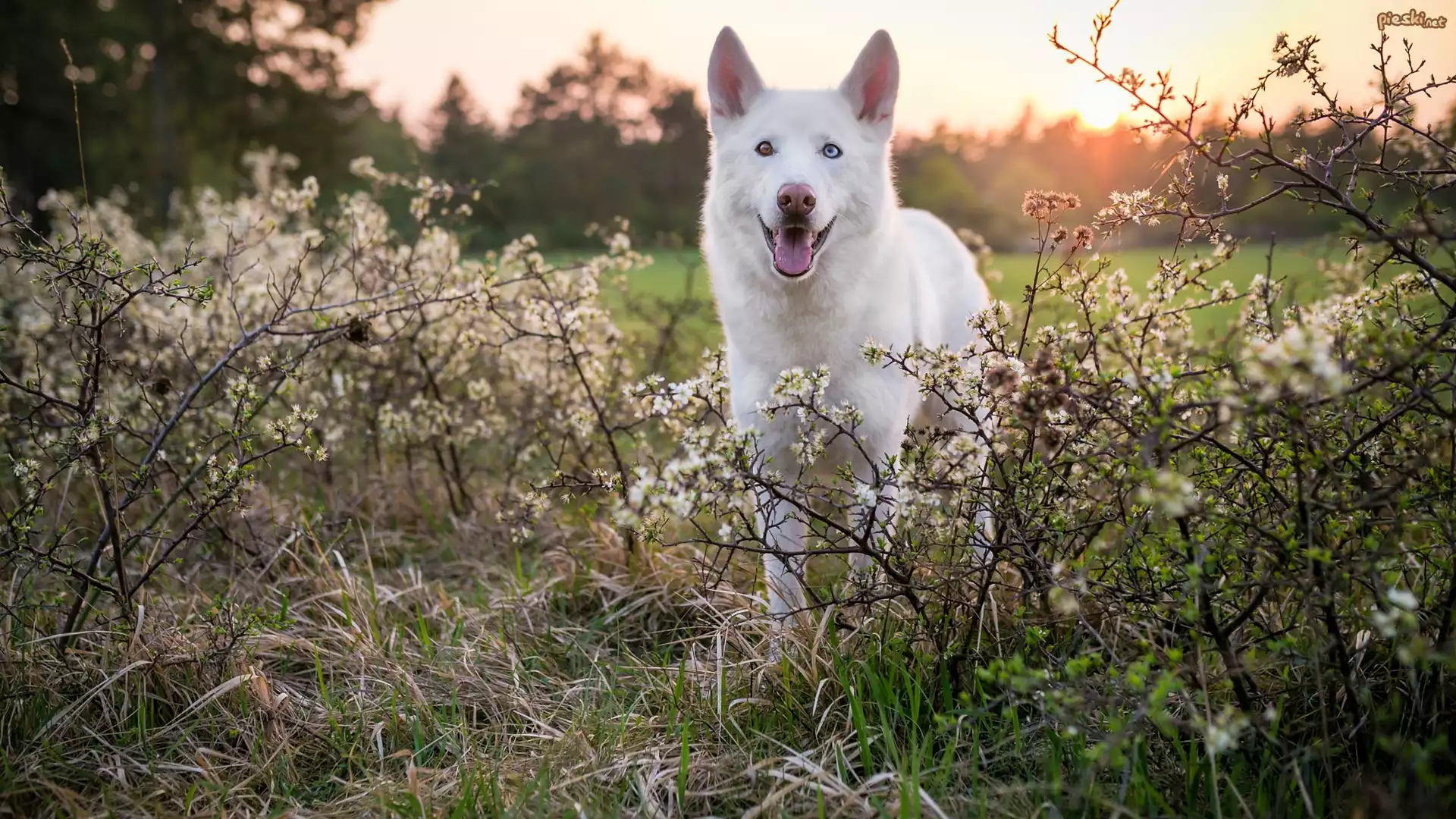 Pies Pies, Biały owczarek szwajcarski, Trawa, Krzewy, Kwiaty