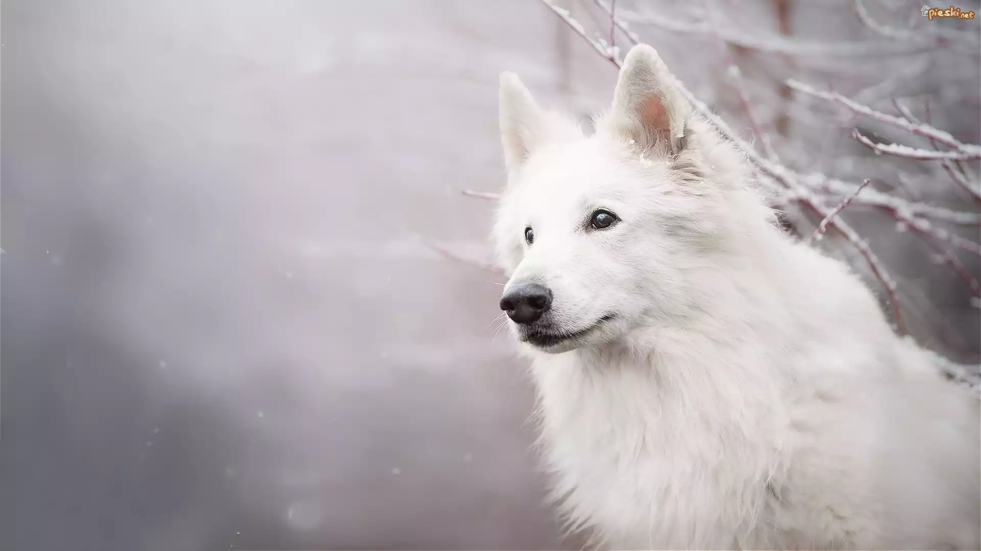 Pies Pies, Biały owczarek szwajcarski, Mordka, Gałązki, Śnieg