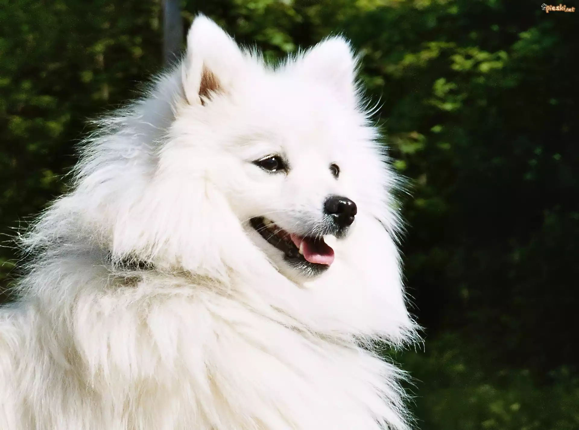 Biały, Pies, Szpic japoński, Wrzosy Bialy, Pies, Szpic japoński Pies, Szpic japoński, Ubranko Biały, Pies, Szpic japoński, Mordka, Rozmyte, Wrzosy