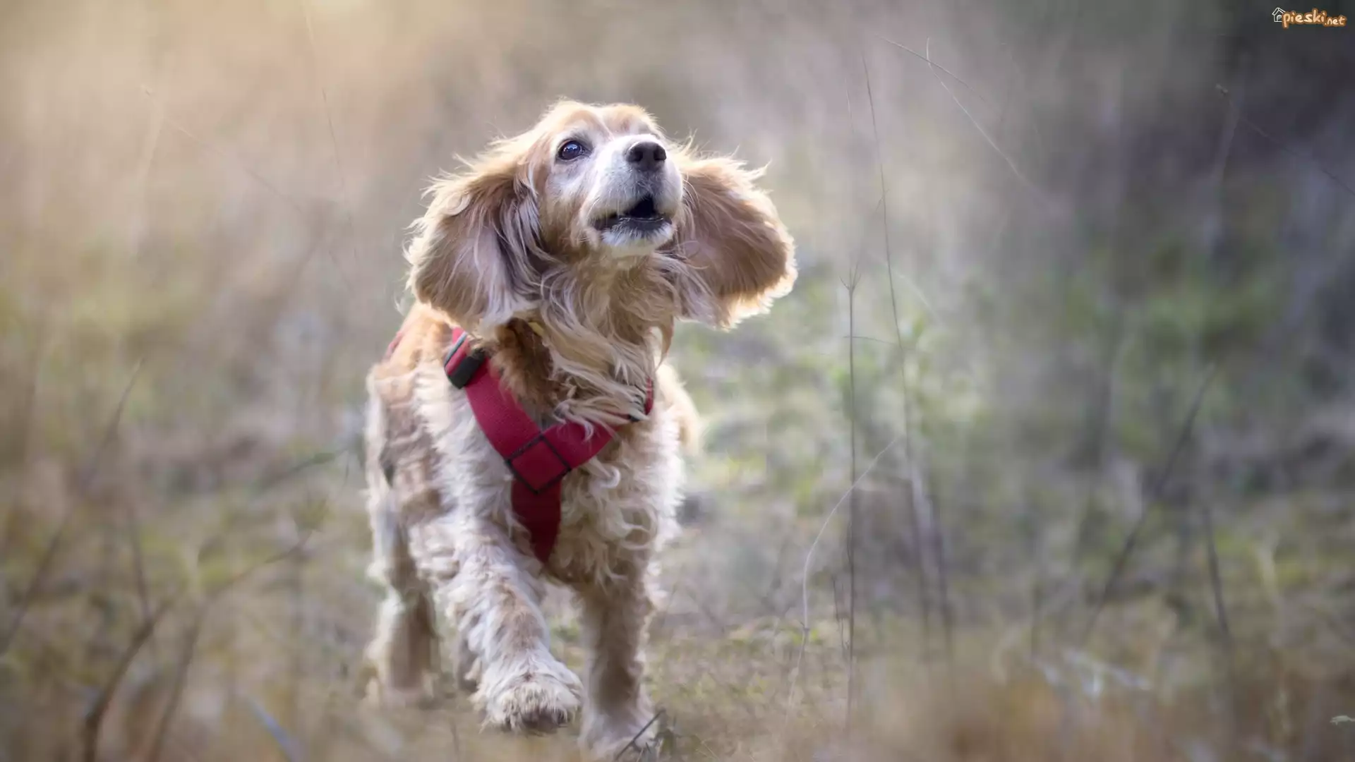 Pies Pies, Biegnący, Cocker spaniel angielski, Szelki, Rozmyta, Łąka