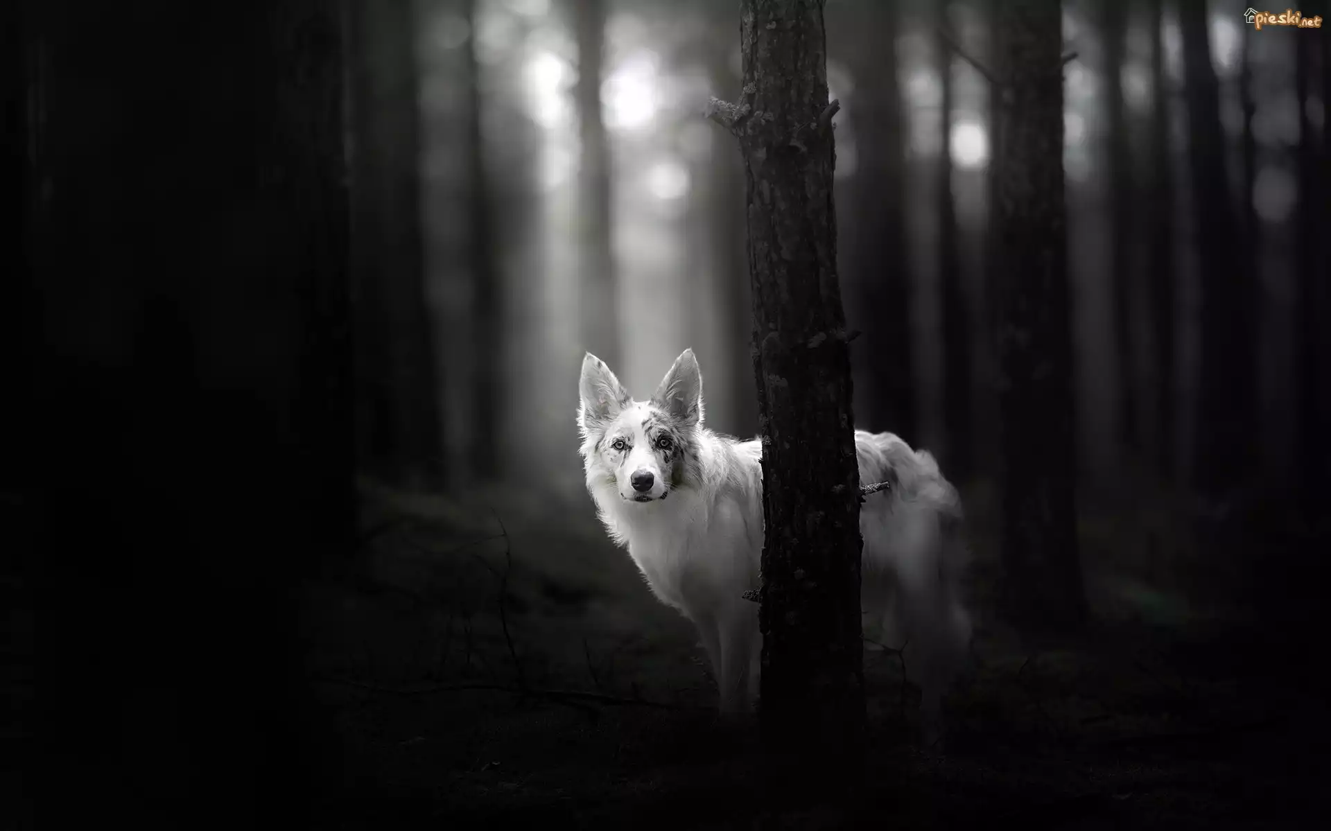 Pies Border collie, Drzewa, Las, Czarno-Białe
