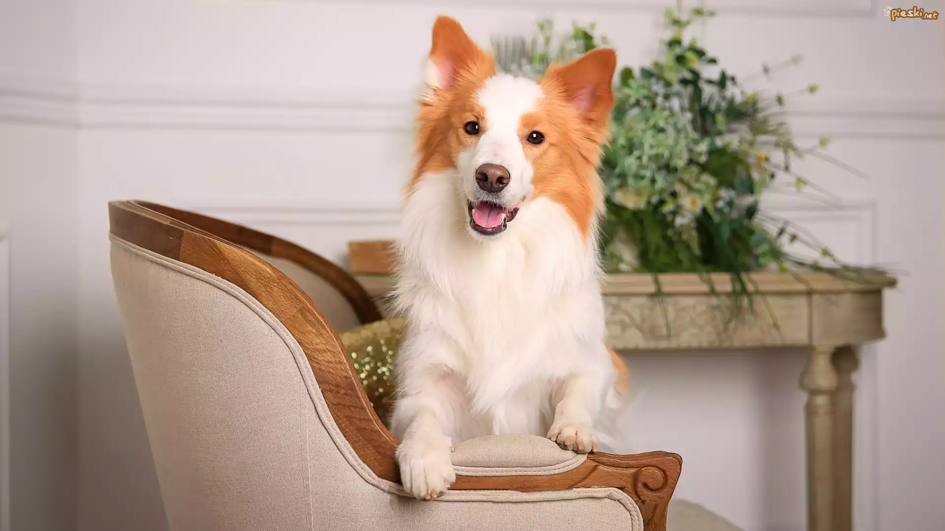 Pies Pies, Border collie, Mordka, Fotel, Stolik, Kwiaty