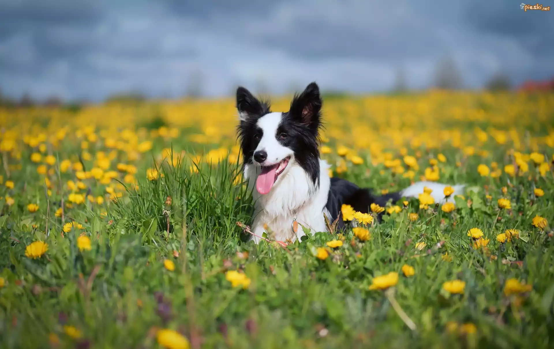 Pies, Border collie, Łąka, Trawa, Mniszek pospolity