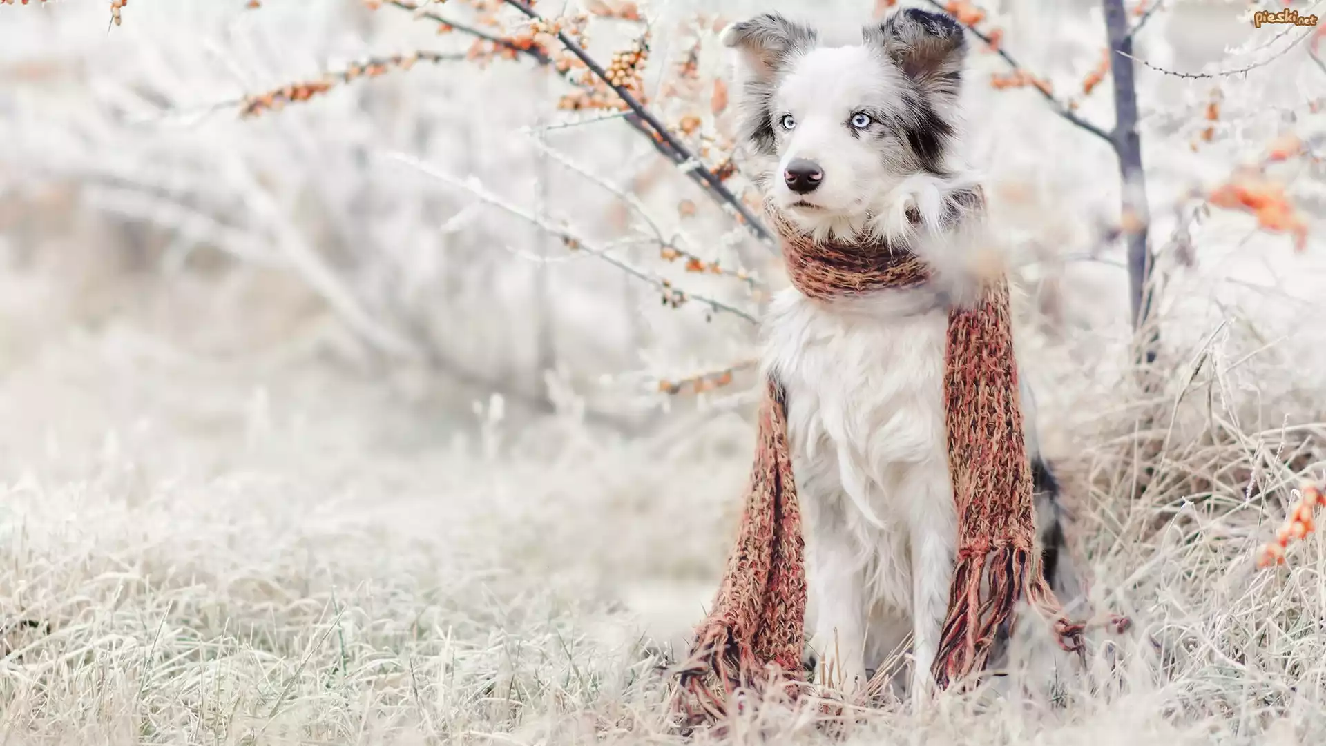 Pies Pies, Border collie, Szalik, Szadź, Trawa, Rośliny