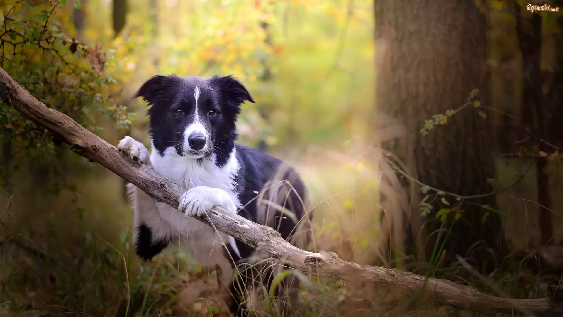 Pies, Border collie, Gałąź, Las, Drzewa, Trawa