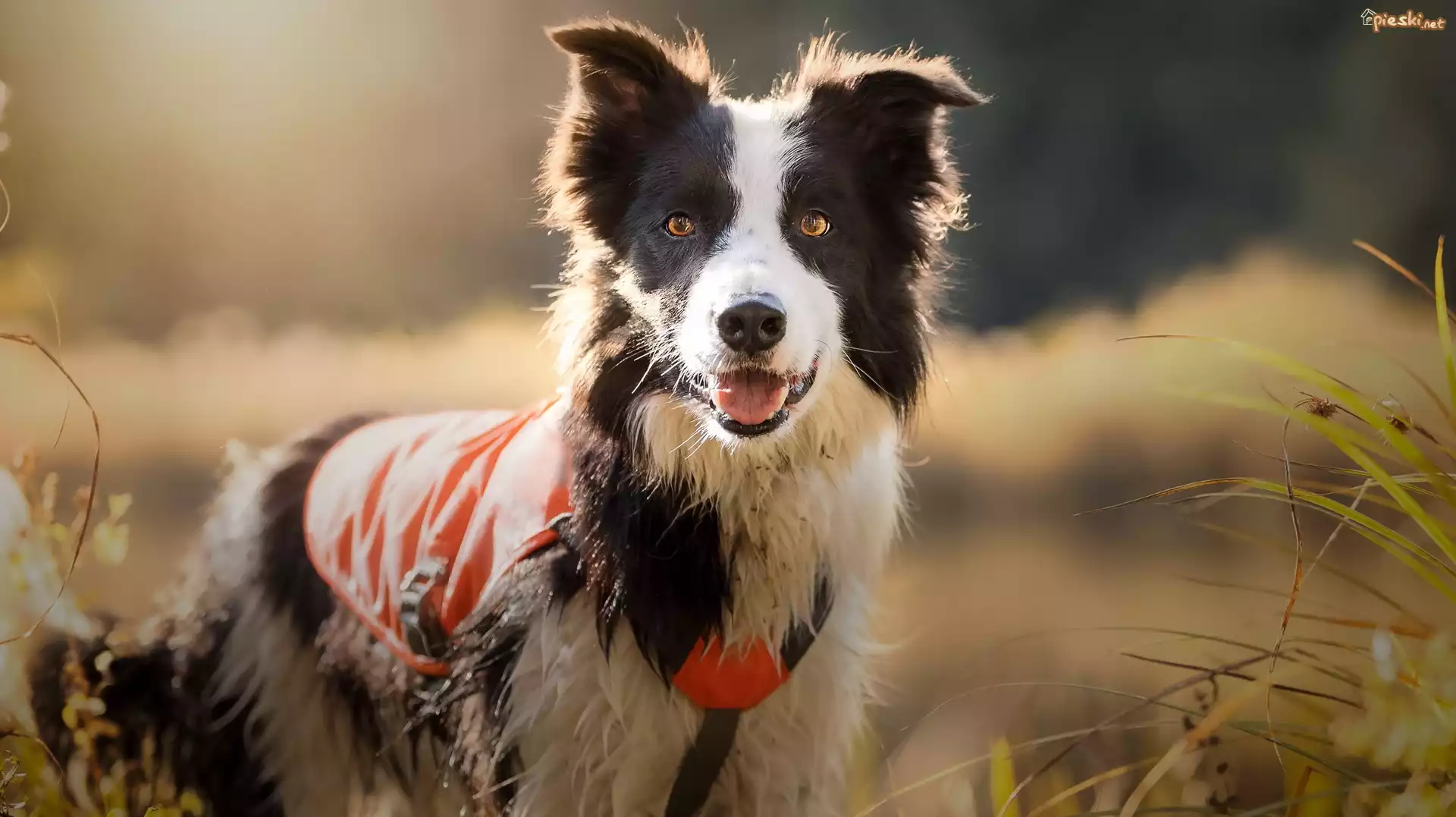 Pies Border collie, Łąka, Trawa, Szelki, Okrycie