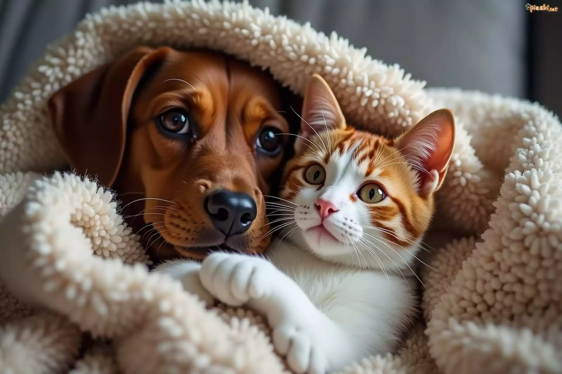 Pies Biało-rudy, Kot, Brązowy, Pies, Koc