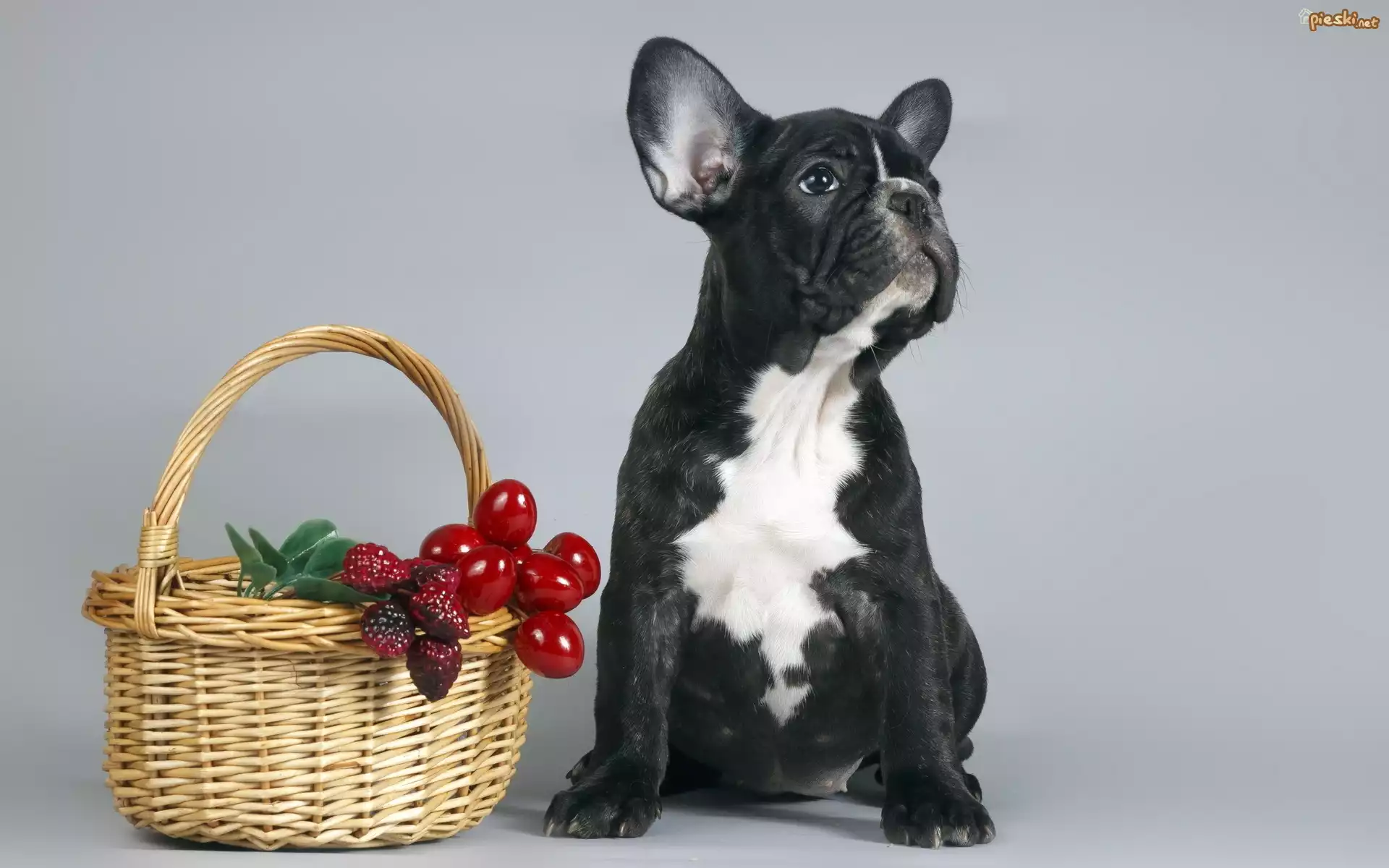 Pies Buldog, Francuski, Koszyk, Owoce