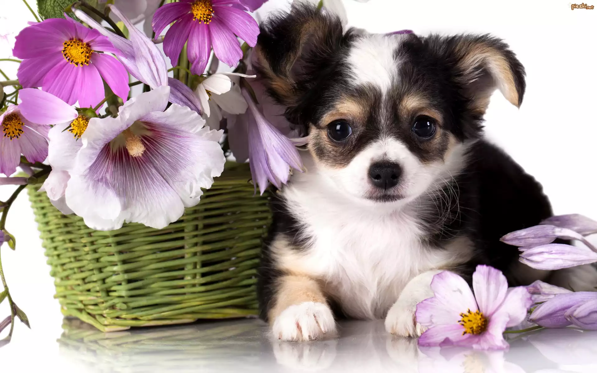 Chihuahua, Szczeniak, Kosz, Kwiatki