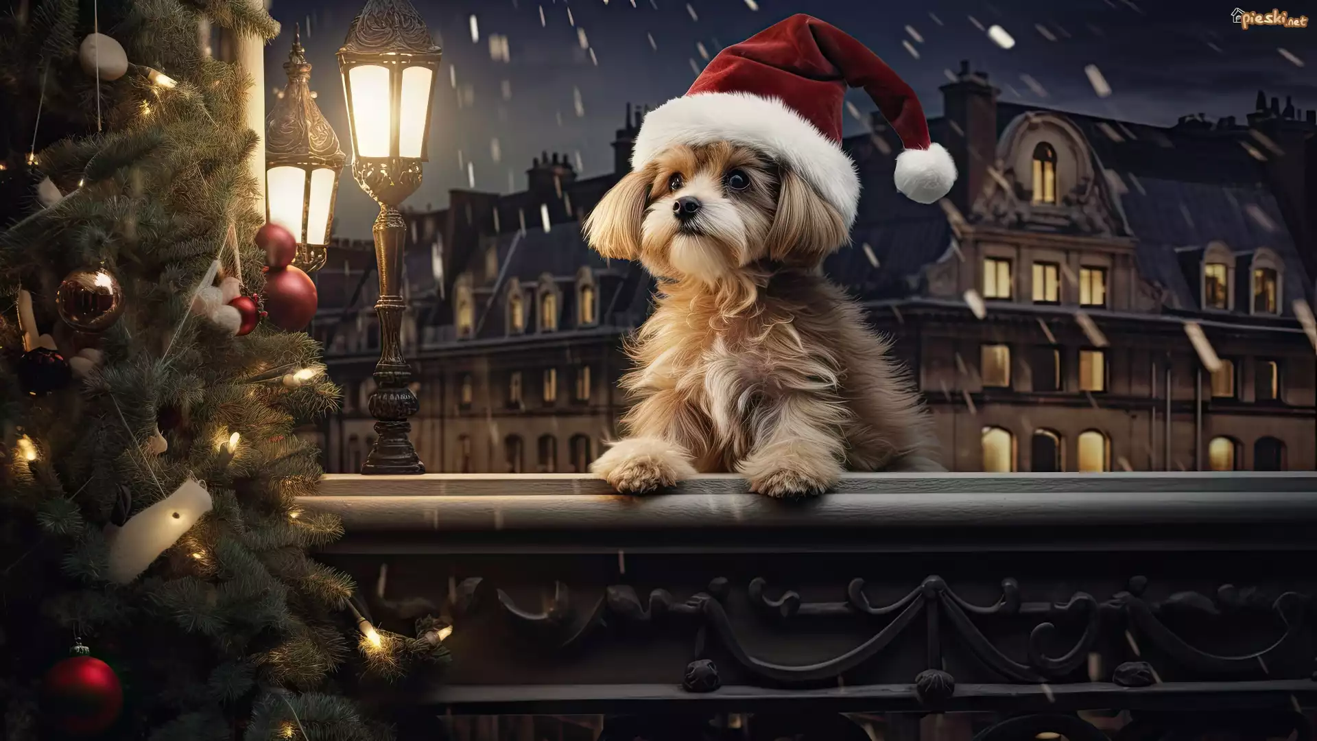 Pies Zima, Pies, Czapka, Choinka, Latarnie, 2D