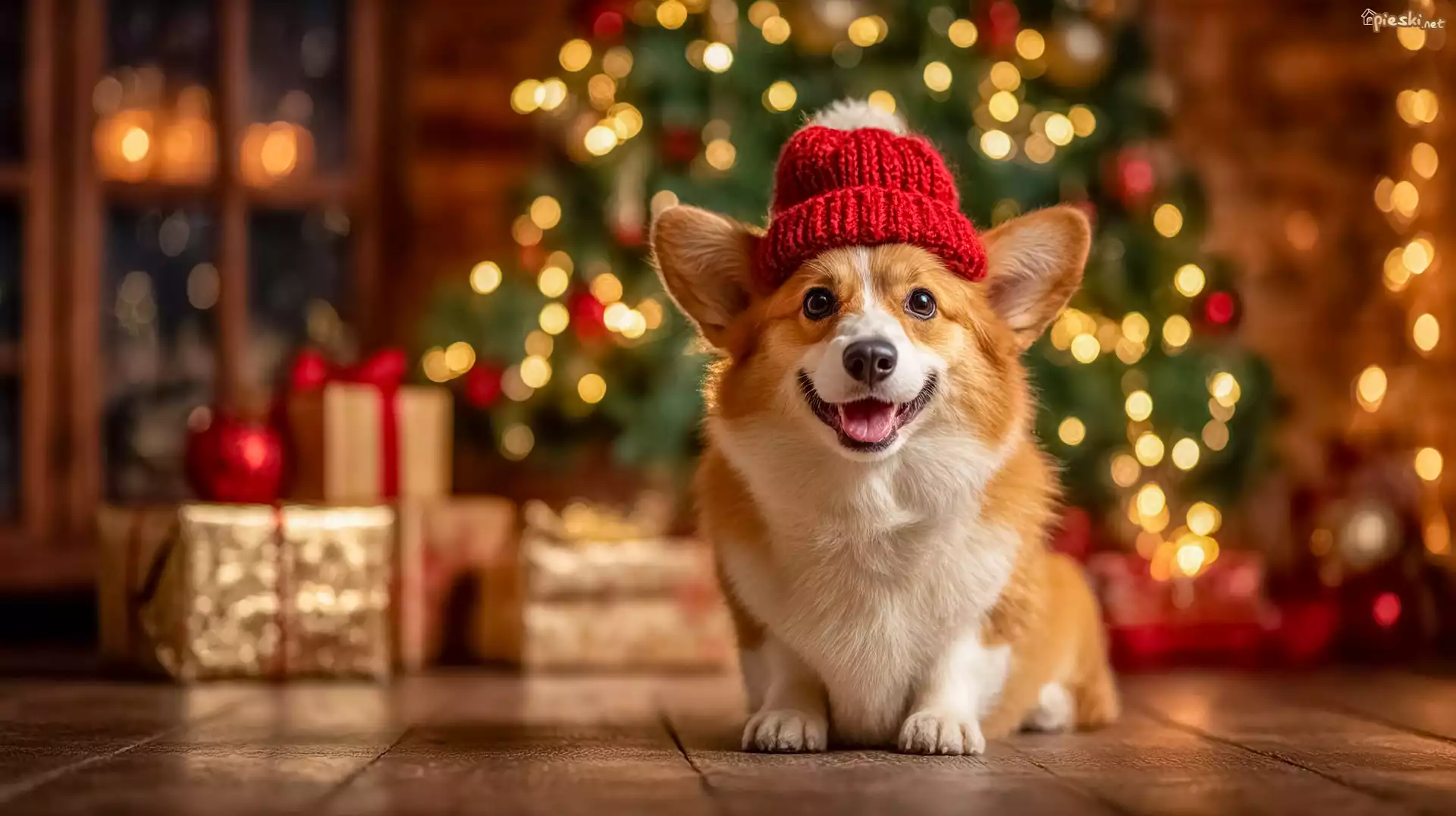 Pies Pies, Welsh corgi pembroke, Czerwona, Czapka, Prezenty, Choinka