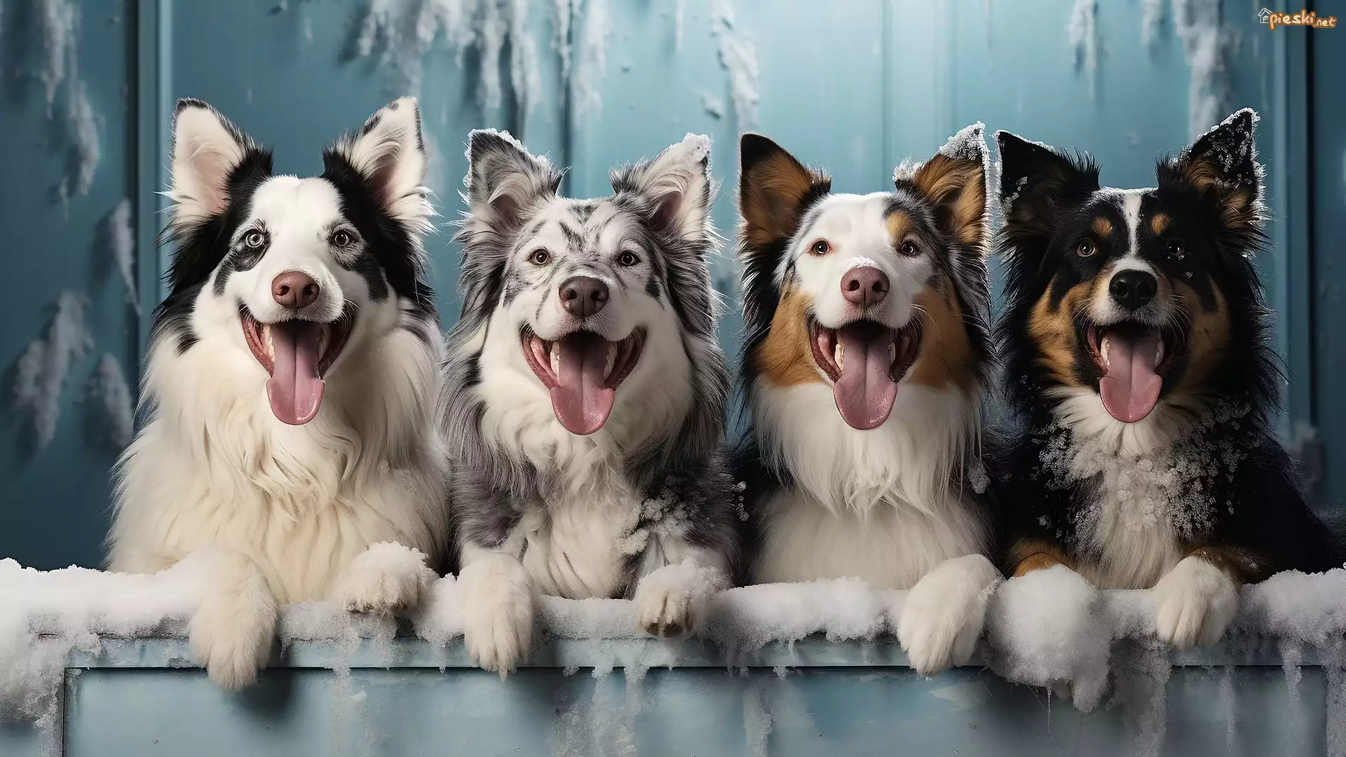 Cztery, Psy, Border collie, Jęzory, Zmarznięty, Śnieg
