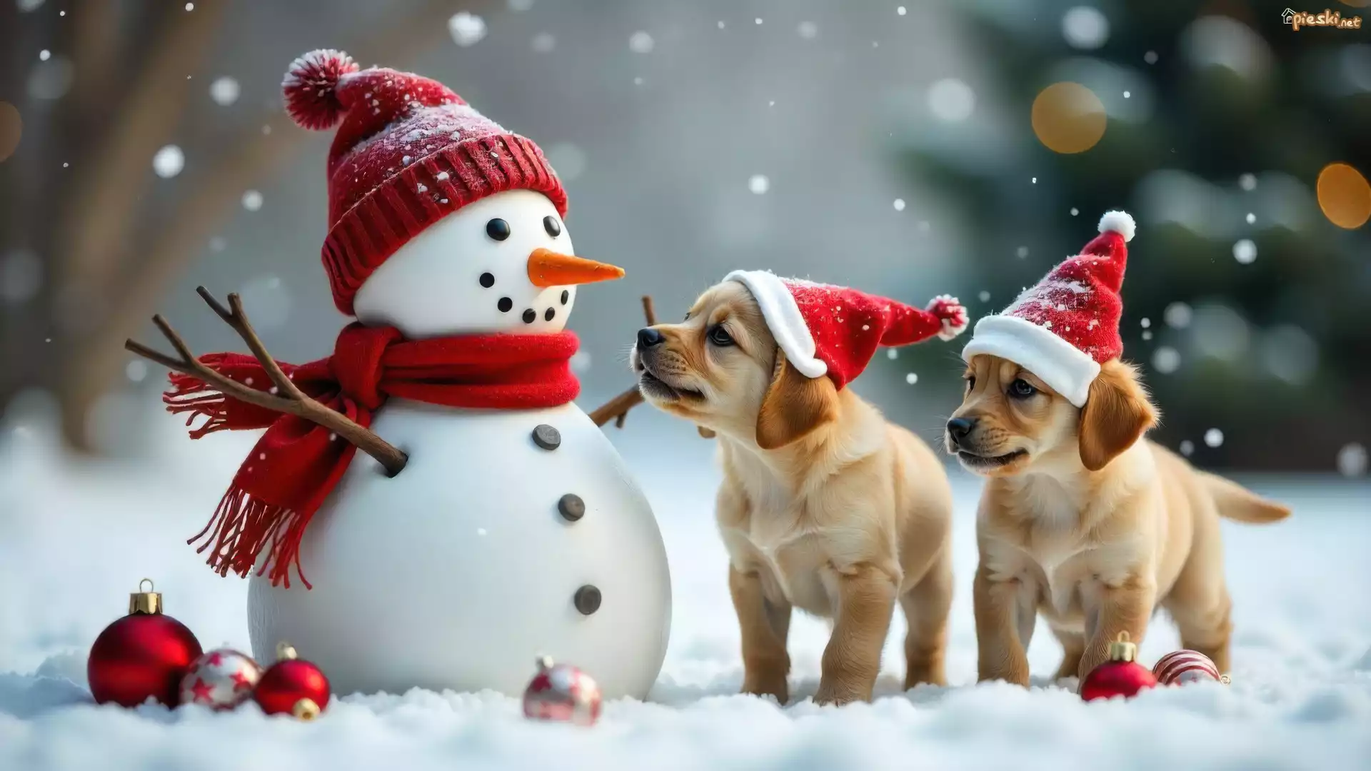 Pies Zima, Psy, Szczeniaki, Czapki, Mikołaja, Bałwanek, Bombki