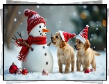 Zima, Psy, Szczeniaki, Czapki, Mikołaja, Bałwanek, Bombki