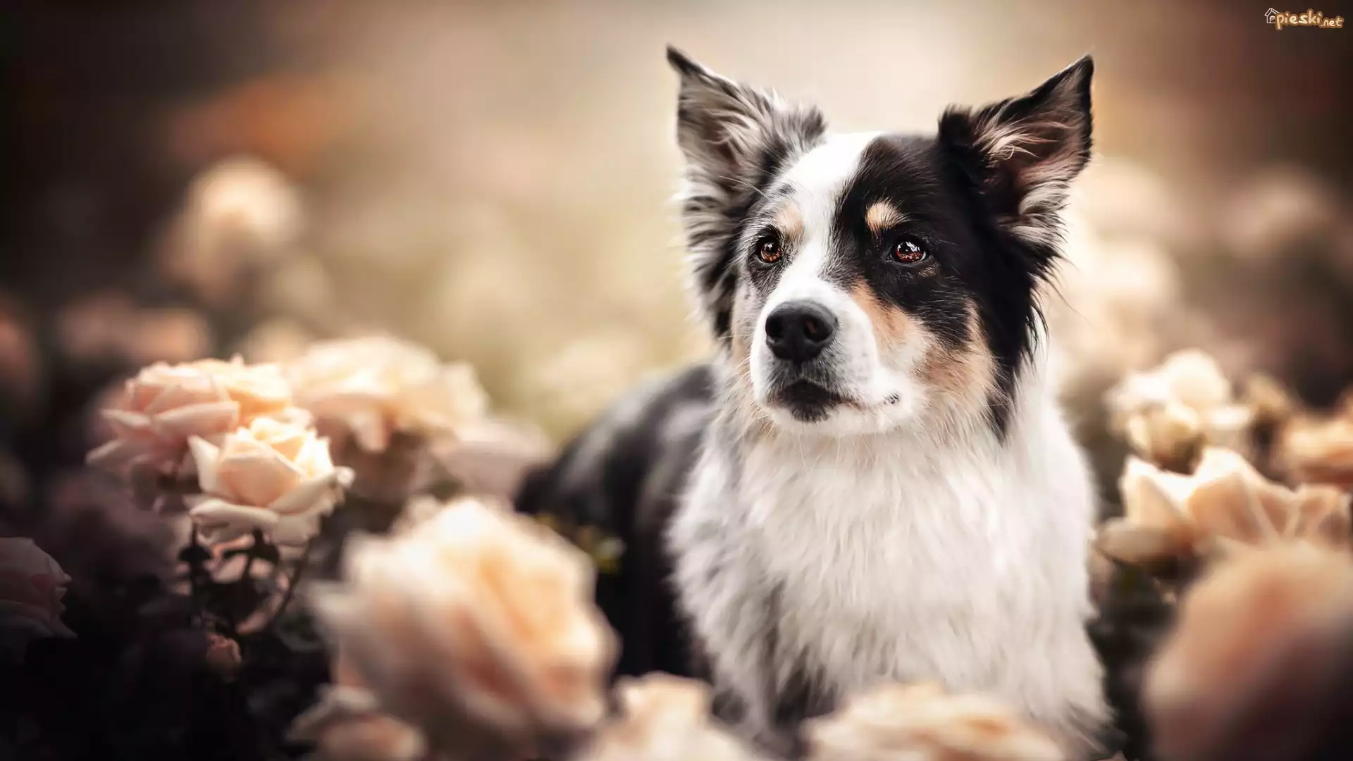 Pies, Czarno-biały, Owczarek australijski, Róże, Rozmycie