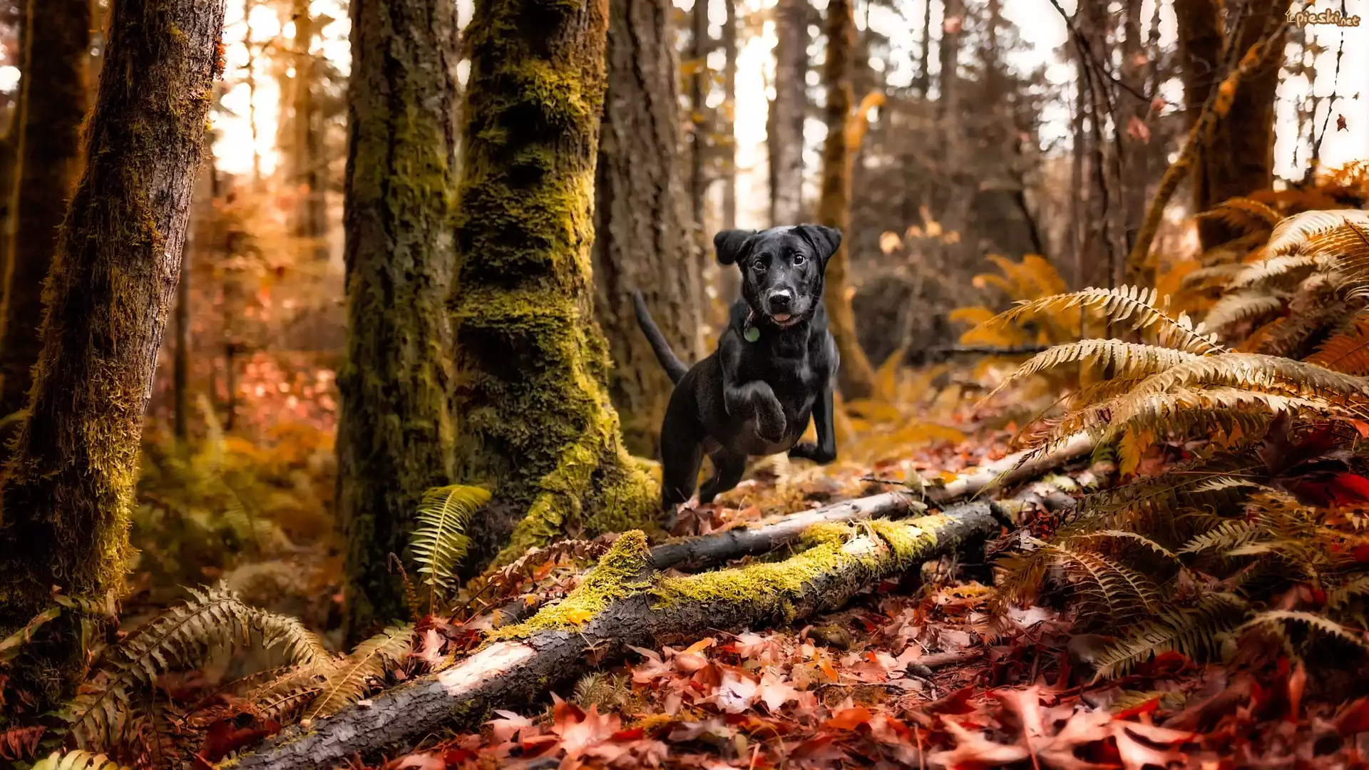 Pies Czarny, Pies, Las, Drzewa, Paprocie, Rośliny