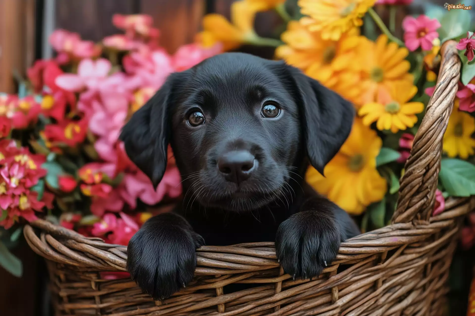 Szczeniak, Czarny, Pies, Koszyk, Kwiaty