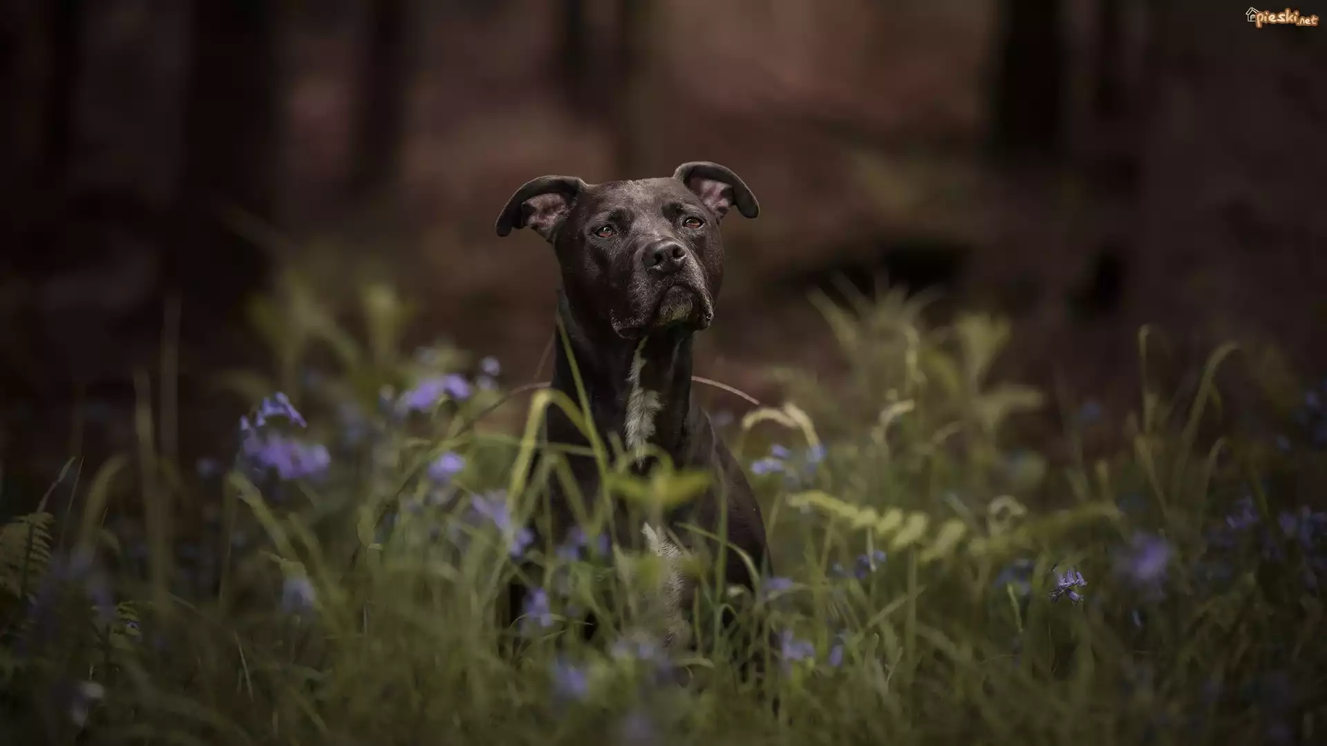 Pies Czarny, Pies, Trawa, Kwiaty