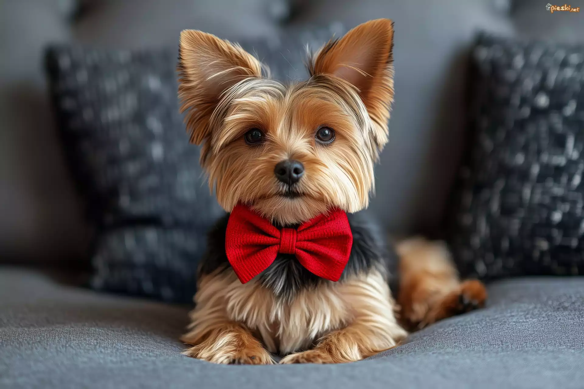 Pies Pies, Yorkshire terrier, Czerwona, Muszka, Poduszki