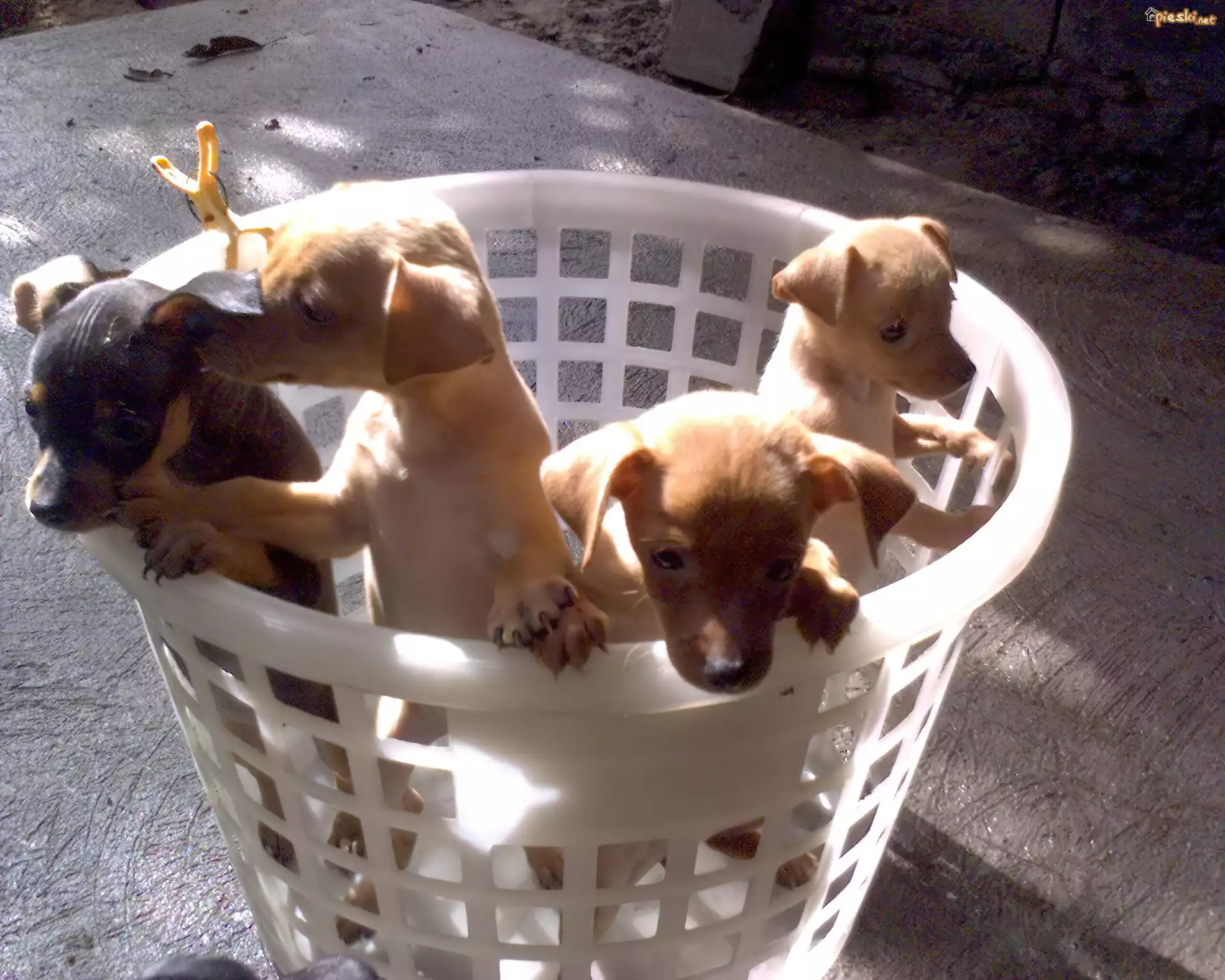 Pies cztery, małe, Pinczery miniaturowe, biały, koszyk
