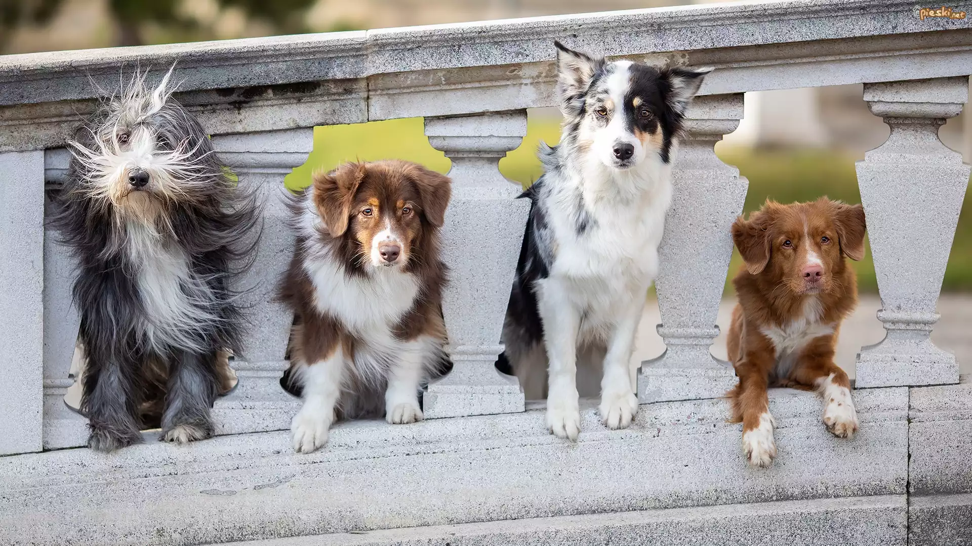 Pies Cztery, Psy, Owczarek staroangielski Bobtail, Owczarek australijski, Border collie, Retriever z Nowej Szkocji, Kamienna, Balustrada |