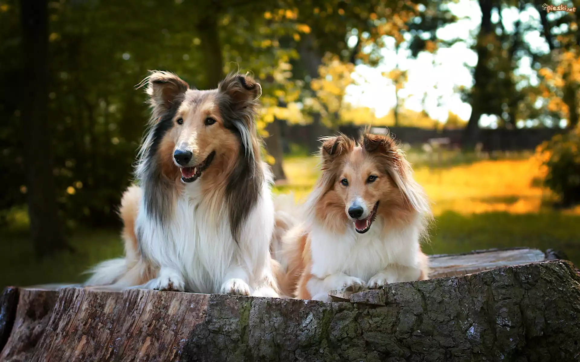 Drzewa, Park, Pień, Dwa, Psy, Owczarki szkockie długowłose