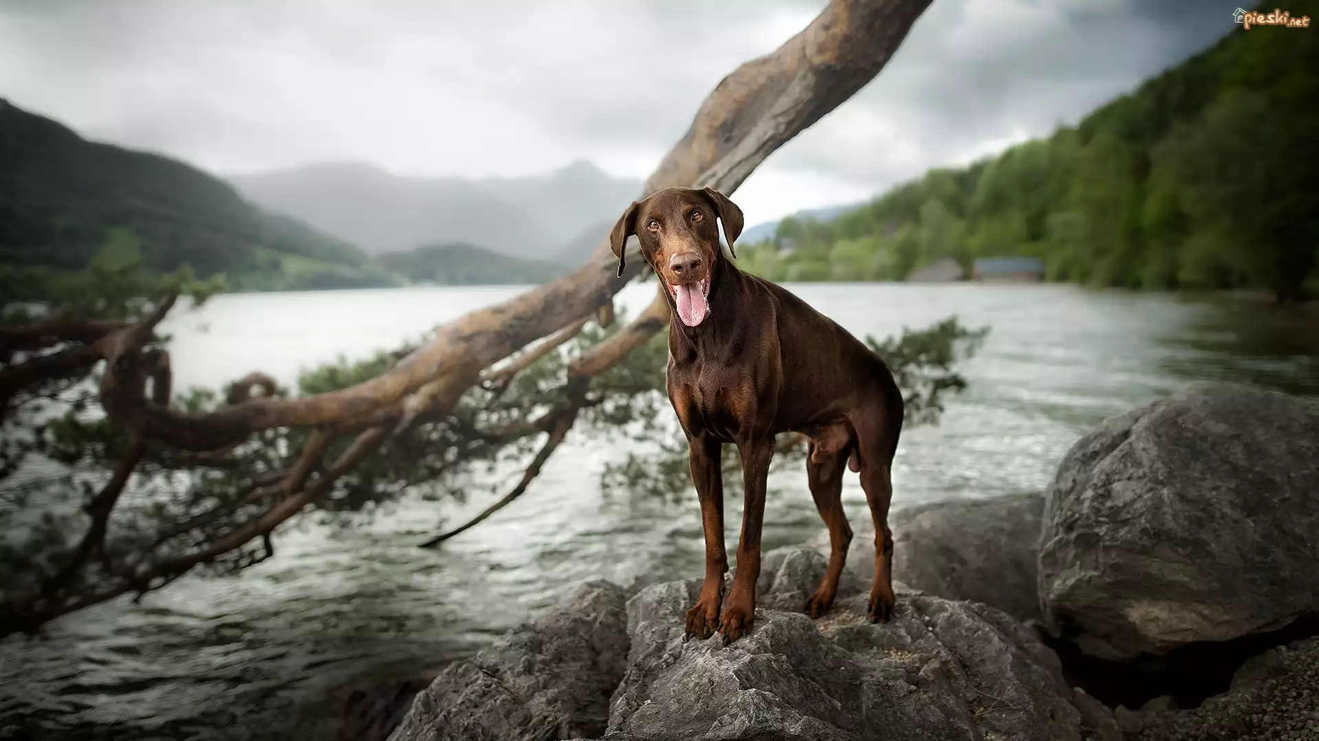 Pies Pies, Doberman, Kamienie, Konar, Krajobraz, Woda, Góry