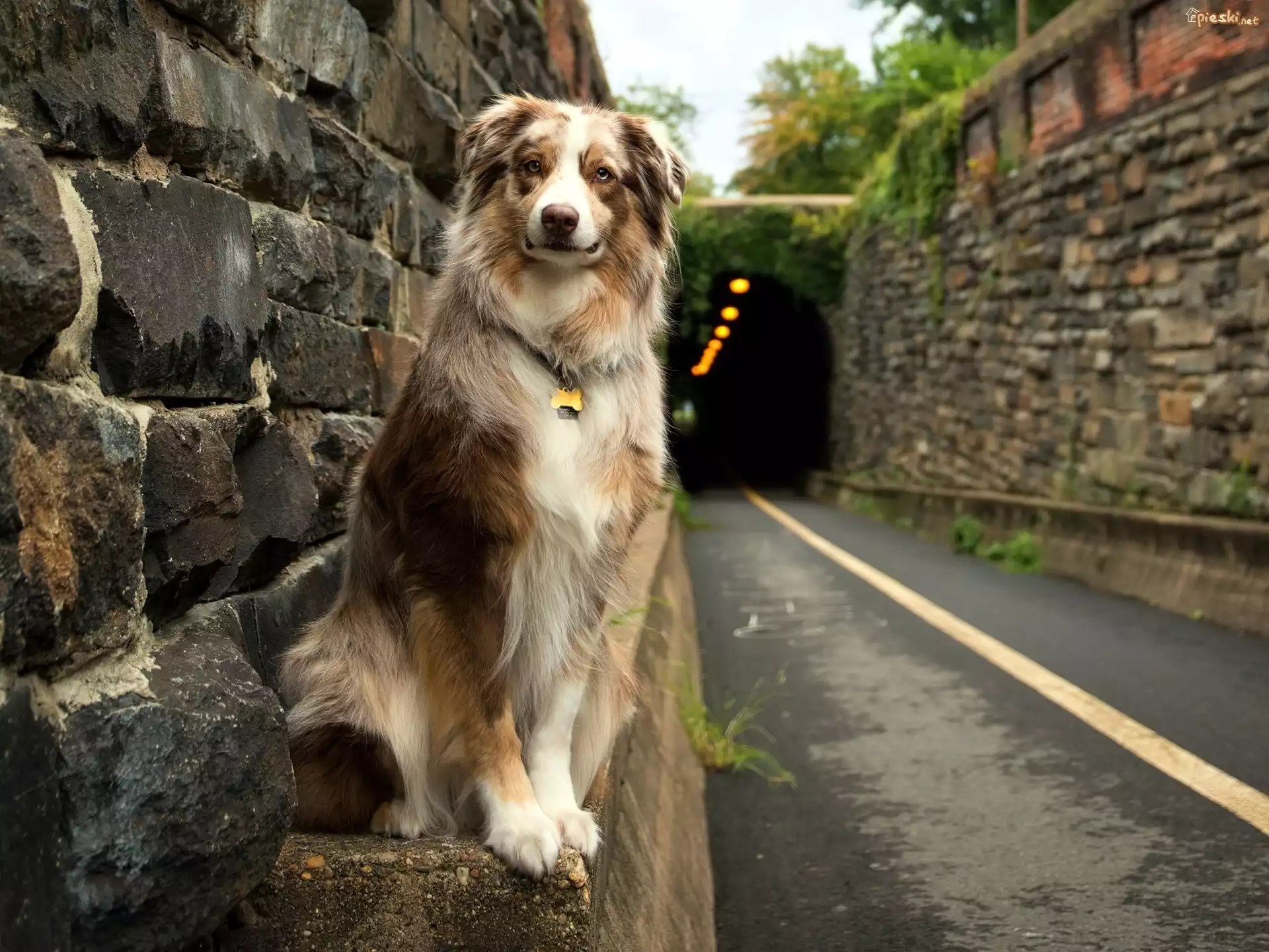 Pies Owczarek australijski, Australian shepherd, Droga, Tunel