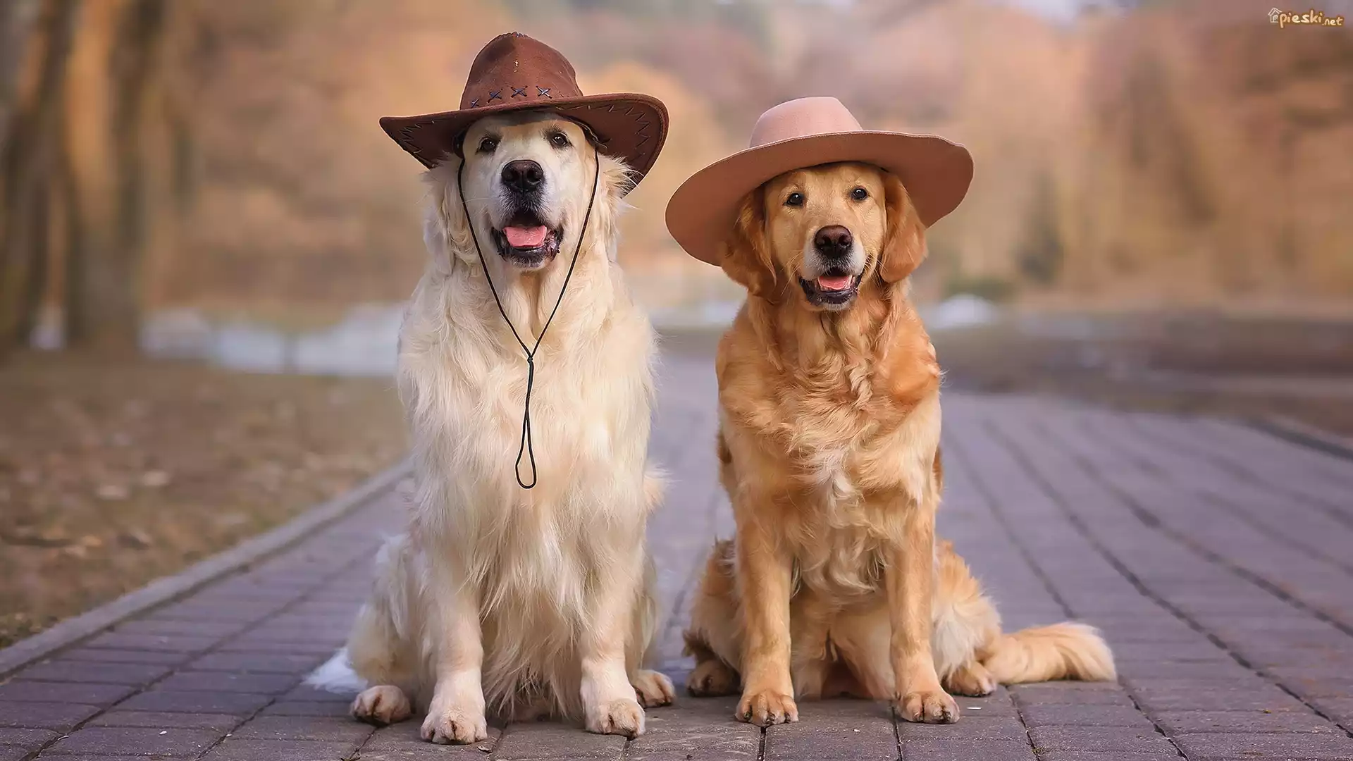 Dwa, Psy, Golden retriever, Kapelusz, Chodnik