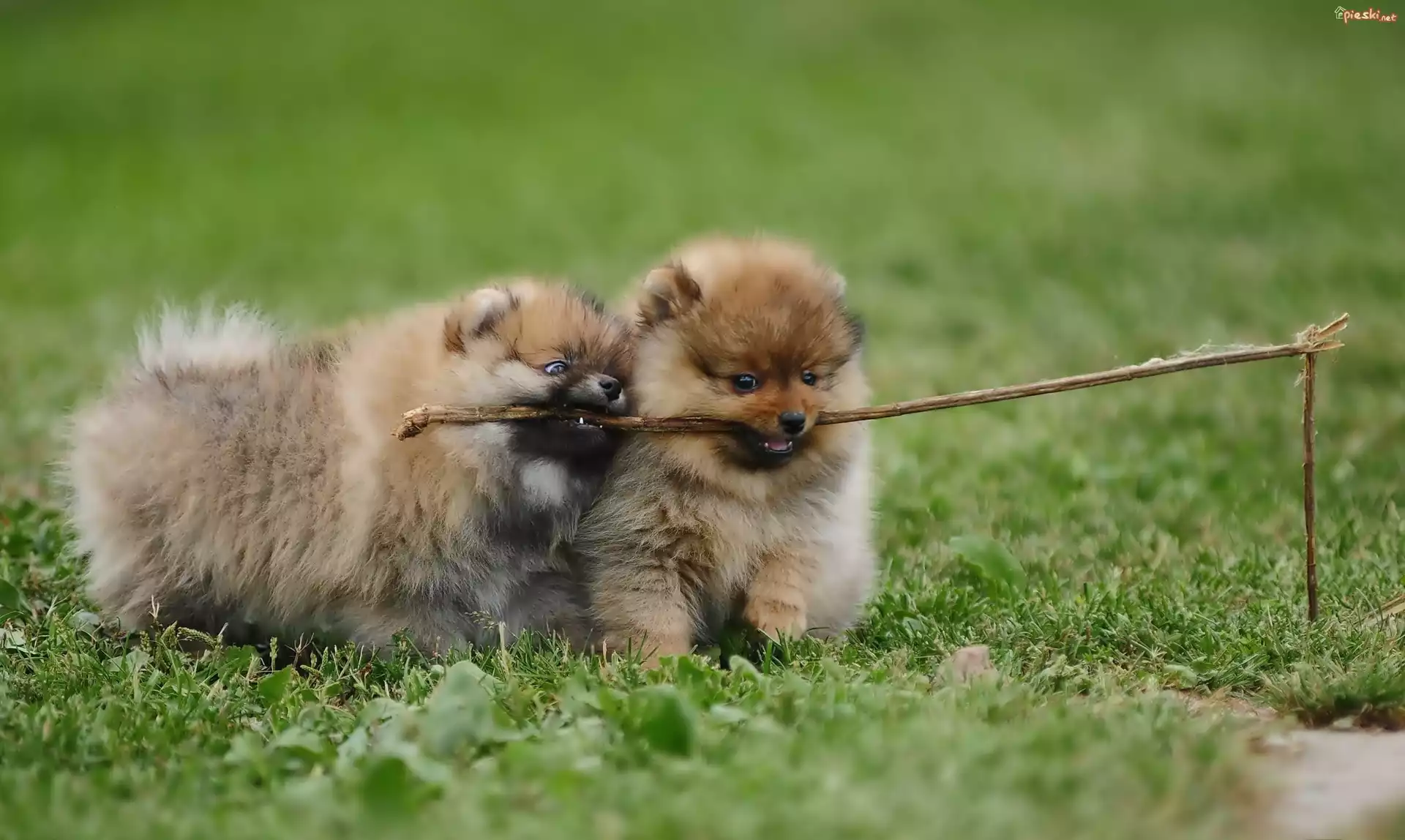 Dwa, Szczeniaki, Szpice miniaturowe, Pomeraniany, Łąka, Patyk, Zabawa