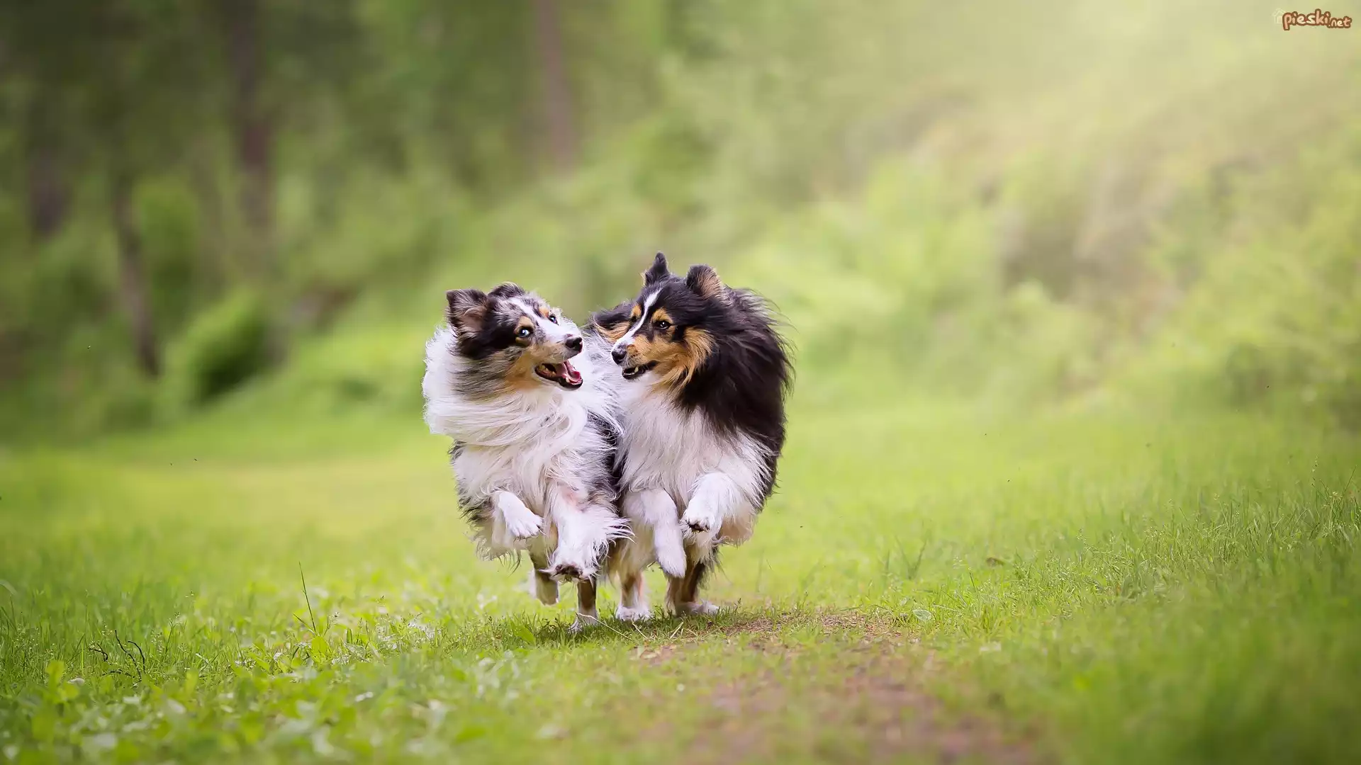 Pies Psy, Dwa, Biegnące, Owczarki szetlandzkie, Polana, Trawa