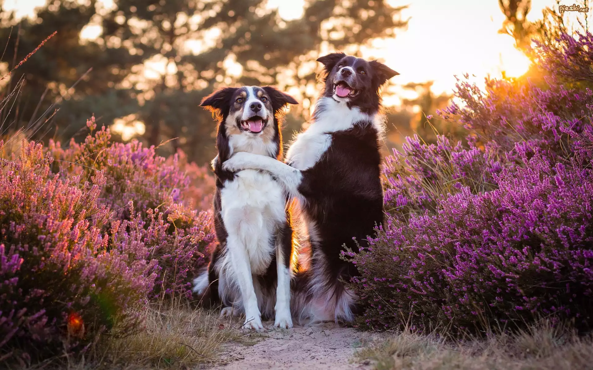Dwa, Psy, Border collie, Wrzos, Światło słoneczne, Światło Słoneczne
