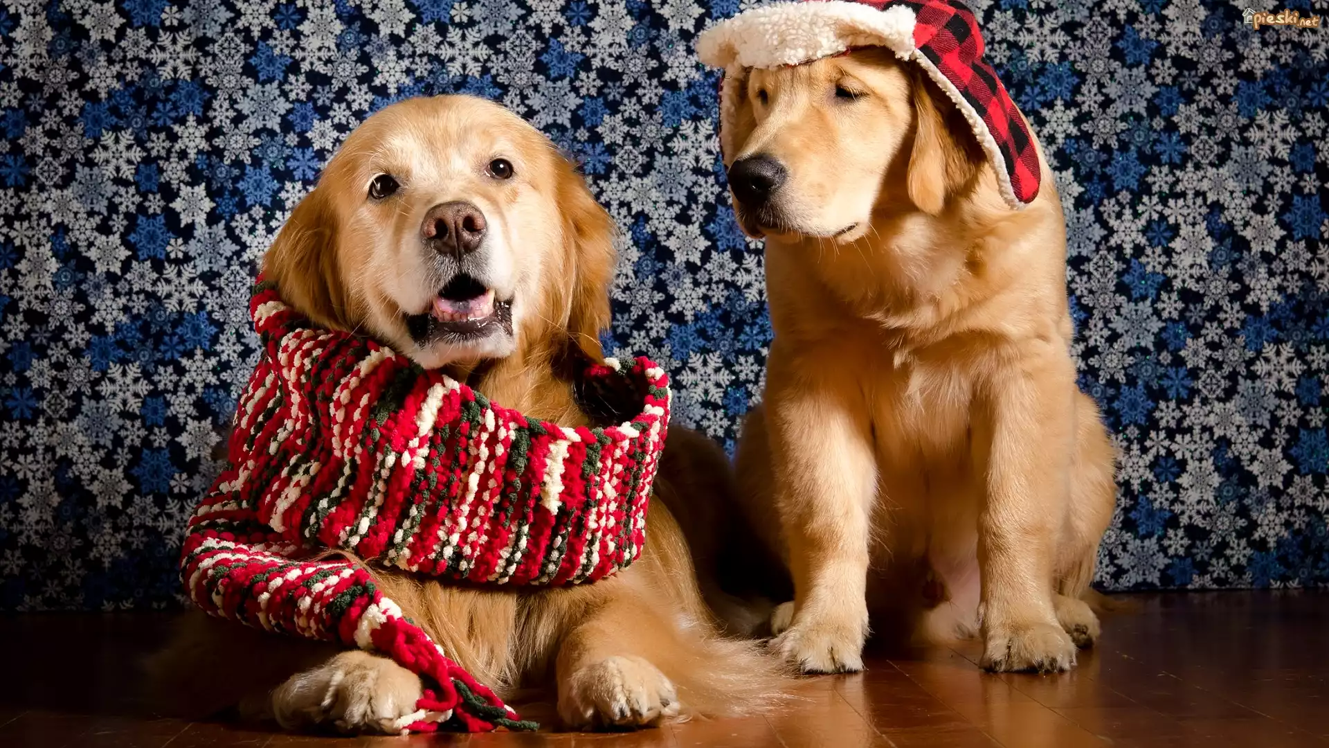 Dwa, Psy, Golden retriever, Szalik, Czapka