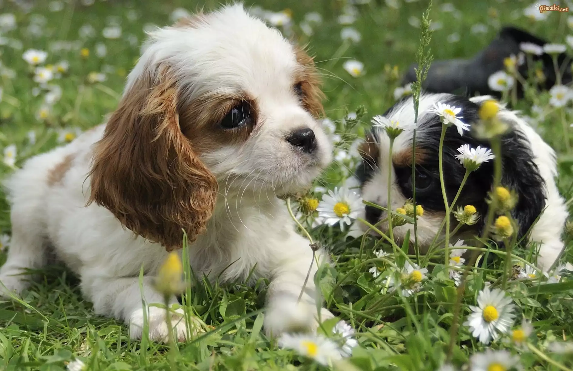 Pies Dwa, Szczeniaczki, Trawa, Kwiatki