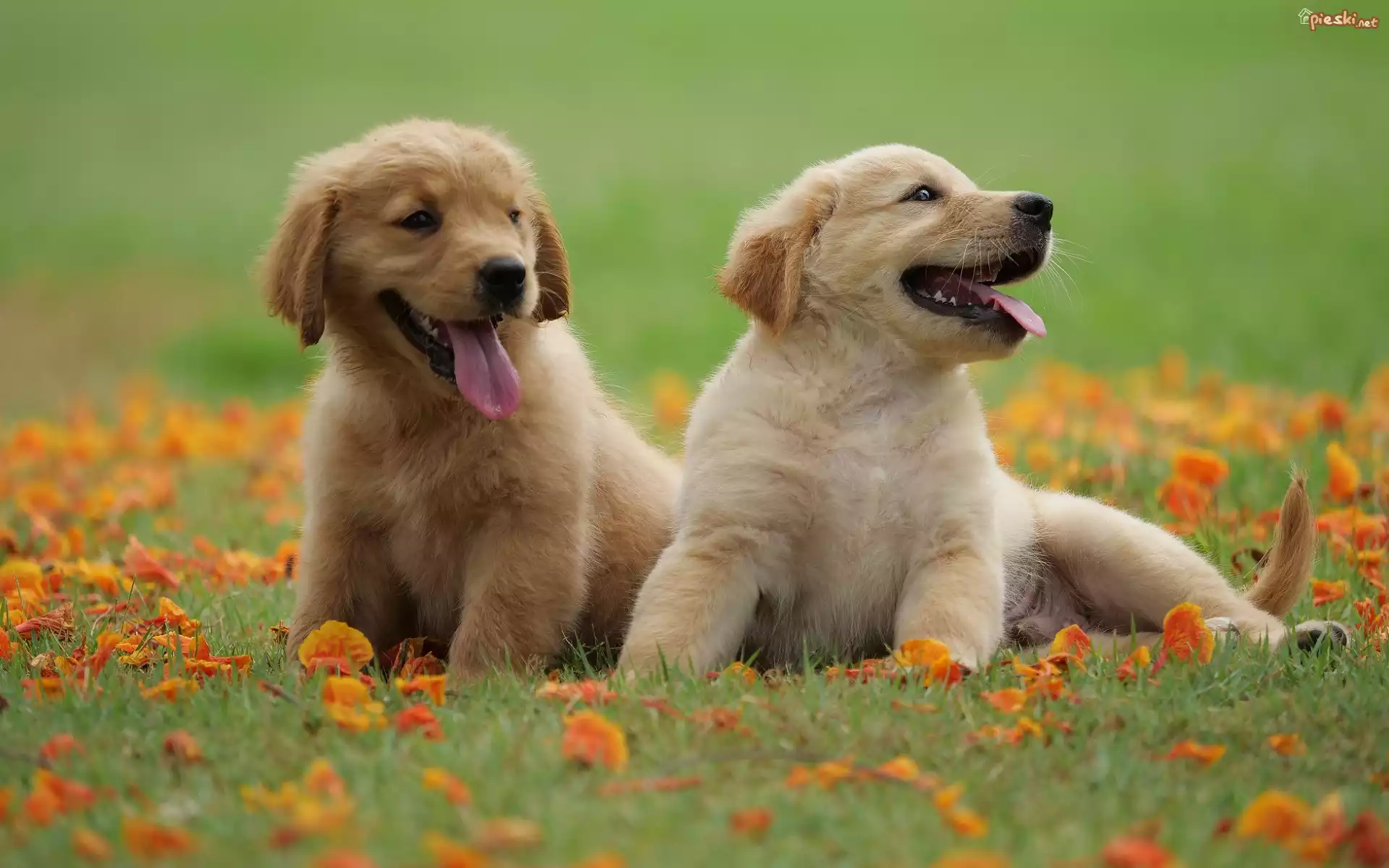 Pies Dwa, Szczeniaki, Golden retriever, Zielona, Trawa