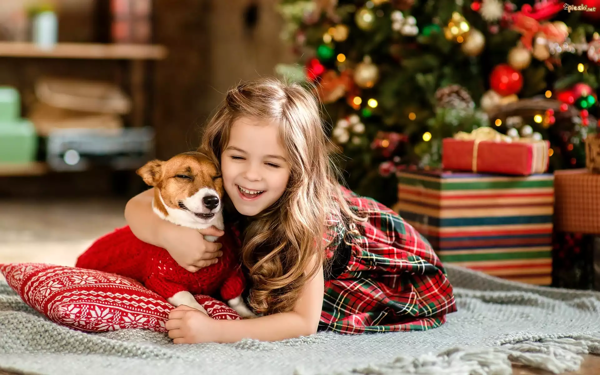 Pies Dziewczynka, Dziecko, Pies, Przyjaźń, Radość, Choinka, Świąteczne