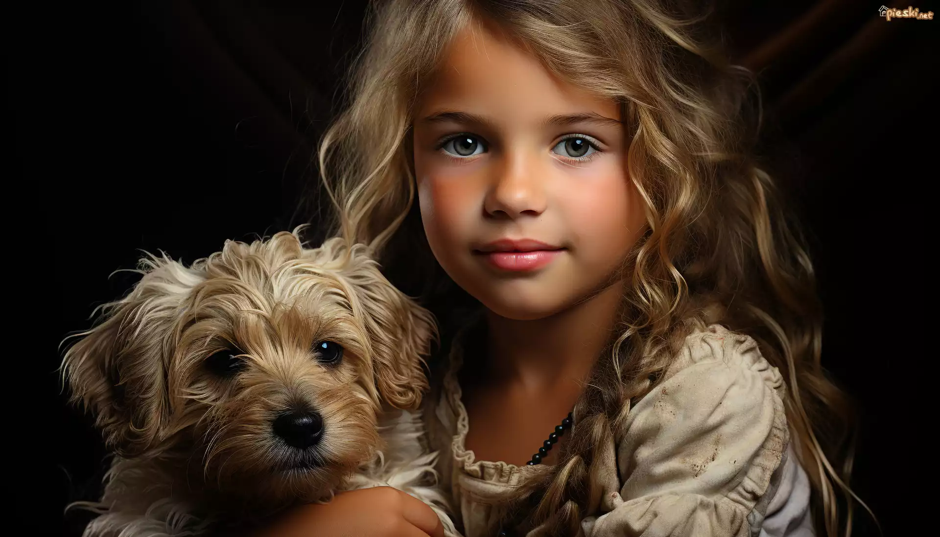 Dziecko, Dziewczynka, Długie, Włosy, Blondynka, Sukienka, Szczeniak, Pies, Grafika
